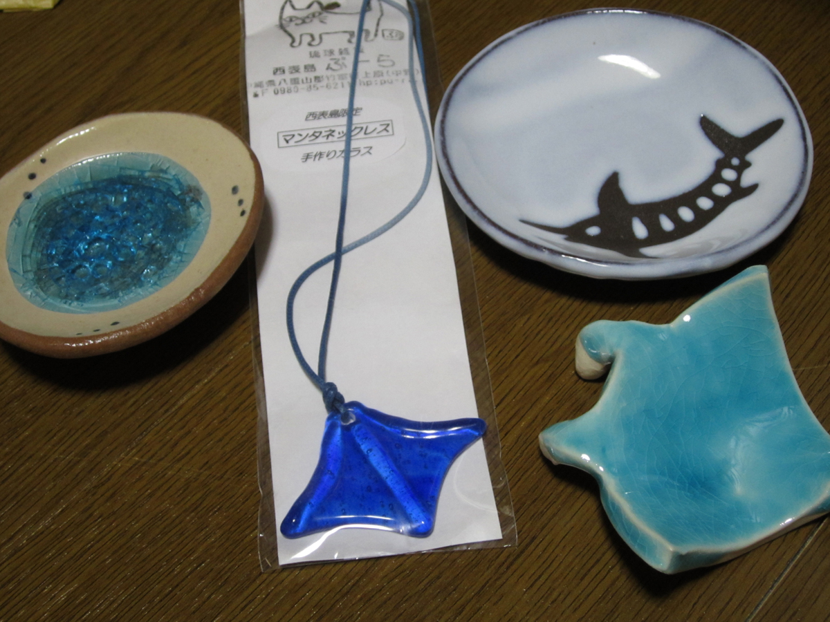 八重山の雑貨ってどれもレベル高い!まぁ個人の好みの問題かもしれないけど。左の、水を張ったような豆皿以外は全部西表島の雑貨屋さんで購入したものです。どれもかわいくてオサレー!あと、八重山はマンタグッズが多かったね!右下の置物、マンタの形になってるんですがお香立てに丁度よいかんじ。上のカジキの豆皿もかわいいわぁ、これもお香立てに購入。他にも、マングローブや島の生き物をモチーフにしたTシャツとか手ぬぐいとか、アクセサリーもとにかくセンスよかったわ。あ、あと自分用にゴールデンシャワーの種買って帰って植えてみたけど、見事に発芽しませんでしたwいくら九州暑いっていっても島とは気候が違うからなぁ。マングローブも1週間もたずに枯らしたし。やっぱり僕には蘇鉄麒麟がお似合いさ。