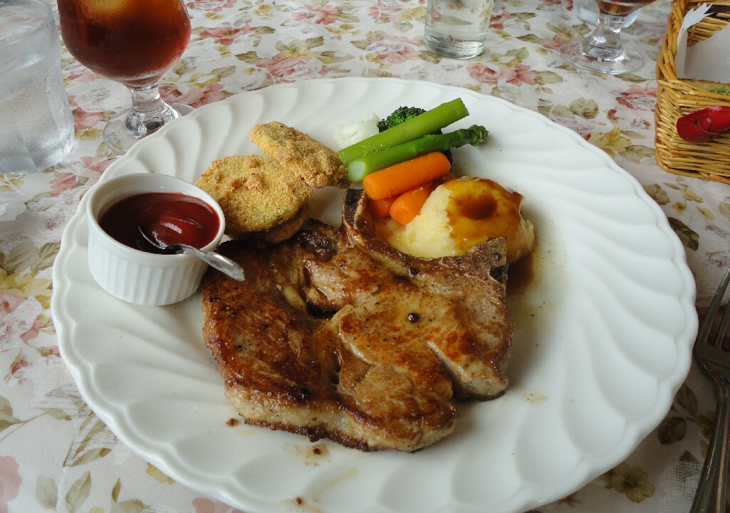 あいかわらず米軍さんでにぎわっておりましたーアメリカ~ン。ここ、ほんと何頼もうか迷います・・。夕方までやってる名物のモーニングも美味いしランチタイムメニューも美味いし単品で頼むやつも美味いし。散々迷った挙句、県産豚のポークチョップ頼んじゃいました。そしてやはりデカかった・・・・・写真じゃ伝わらないだろうけど、手の平の1.5倍あるうえにぶ厚い(汗)豚肉こんなぶ厚く食べたの初めてだよwwもちろん味は間違いないですが、この付け合せにあったグリーントマトフライがね、初めての味なんだけどめちゃくちゃ美味い!!トマトをフライにするとこんな美味いんかってくらい!衣が不思議な食感だったし、これはクセになる・・・。はずれがないぞ、恐るべしローズガーデンww