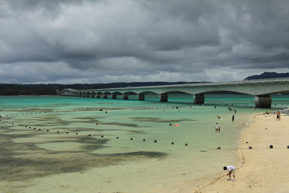 途中、許田の道の駅で小腹を満たしつつ(もずく天旨かったー!)古宇利島に到着です~。日本一の古宇利大橋!曇っちゃいるけどその姿は圧巻です!4年前の正月(だったかな)初めてこの橋を渡ったとき、周りの海のあまりのエメラルドっぷりに家族全員で悲鳴をあげた・・・・(笑)ほんと、沖縄は魅力的な橋が多いわー。あ、でも宮古島に作ってる橋が将来的に日本一になるんですってね、行ってみたい!日本の橋の技術ってすごい!