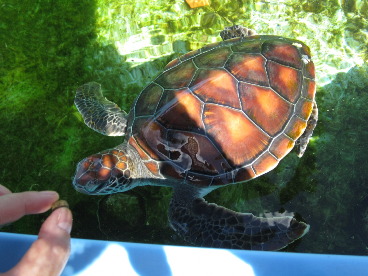 会議室での勉強が終ると、次は外に出てこの日放流するウミガメの身体測定タイムです。今日のクランケ(笑)はアオウミガメ君ですよー。豆知識ですが、ウミガメの中でもアオウミガメは特にキレイ好きらしく、いつもヒレで甲羅の掃除をしてるんだとか。たしかに、研究所にいた子たちも常にヒレで甲羅をサッササッサ磨いてたわ!