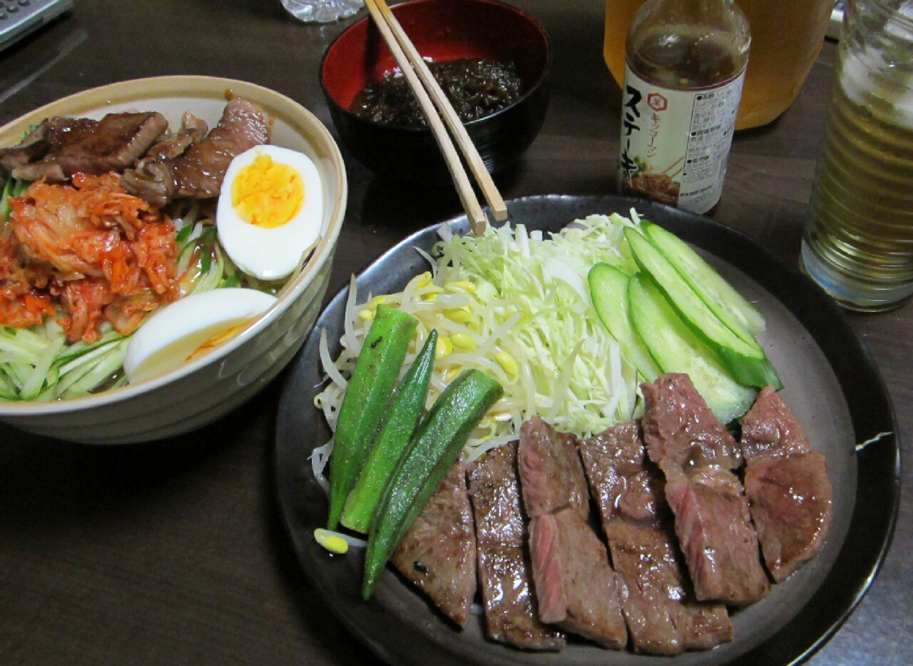 韓国冷麺の方は、前日食べ切れなかった切れ端を焼肉のタレ付けて炙って上にのっけてみた。なんたる贅沢(死)キムチと合うわぁ~(涙)