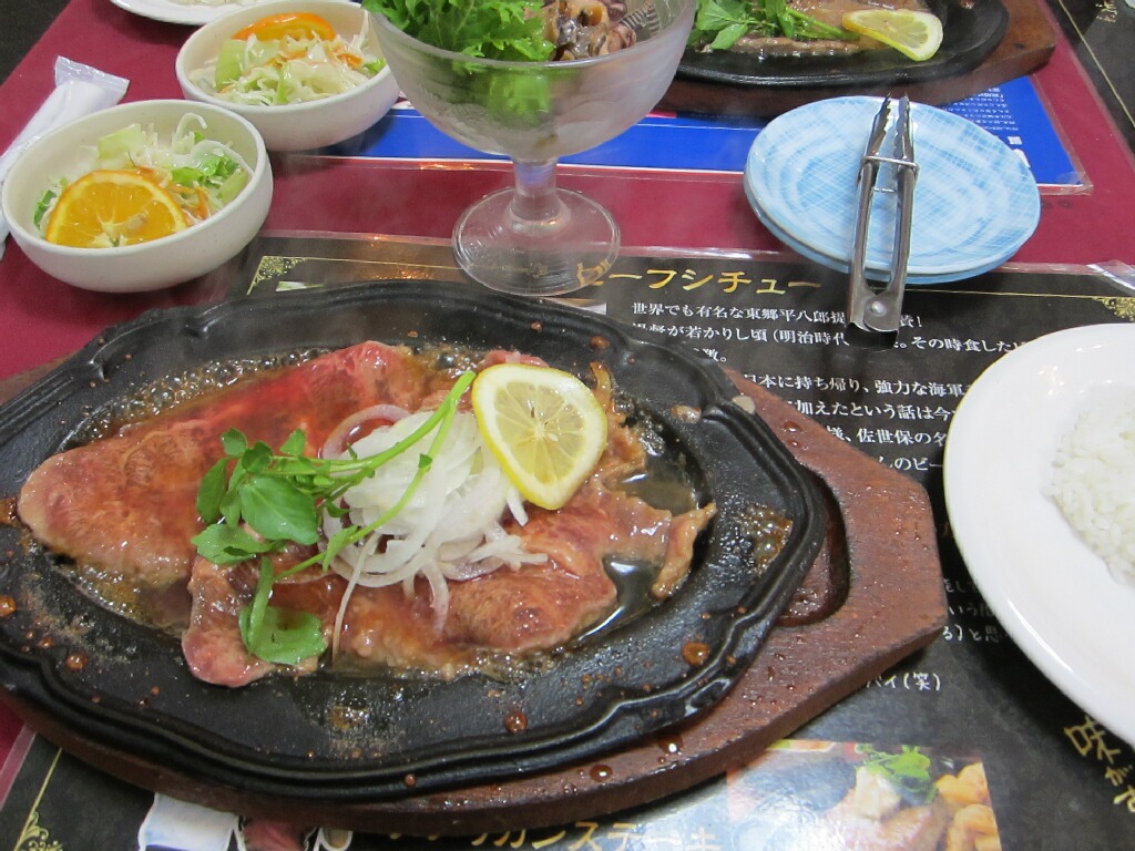 こちらは、HTBで食したものではないんですが、人生初レモンステーキ!佐世保市内からはちょっと離れたお店「時代屋」さんでランチしてきました。レモンステーキ、マジうめぇ(鼻血)ここのお店が有名と聞いて行ってみたけど、大当たりだたアルよー。このお店が特に美味しいのか、他を知らないからなんとも言えないけど、とにかく、次から佐世保に行ったら「時代屋」さんだな、と思うくらいに旨かった。そして何が凄いって、注文してから全部出てくるのに3分かからない脅威のスピード(笑)あの、普通にファストフードより速かったんですが・・・・(汗)お値段もリーズナブルで、まさに旨い・安い・速い!なお店でしたー。レモンステーキ以外にもビーフシチューやらアメリカンステーキやら、肉好きにはたまらないメニューがいっぱいでしたよー。うーーービーフシチューも食べてみたいー絶対美味いよここのは!