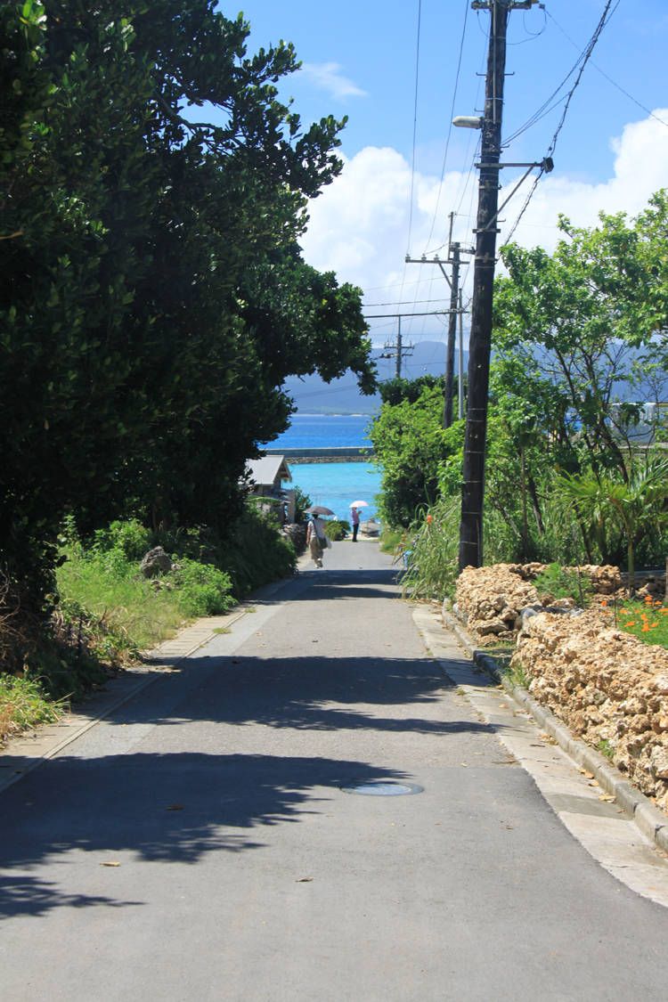 鳩間島はとても小さな島なので、徒歩でも十分1周出来るとの事ですが、そこは、夏真っ盛り、徒歩じゃ途中で野垂れ死ぬと思い自転車を借りて散策することにしましたー。これは集落の南北を抜けるメインストリート。うぅ・・・ここから観ても海の色がヤバイ・・・防波堤の向こうとは別世界な色してる。