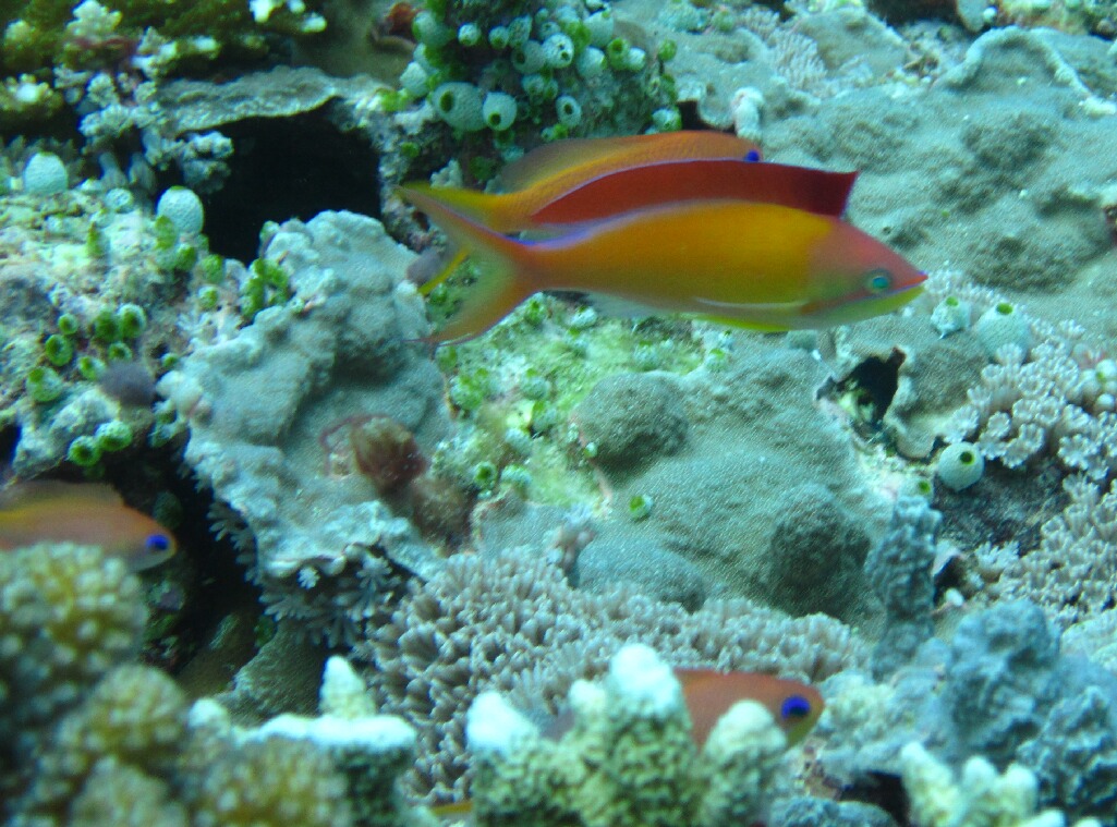 前回ちょろっと紹介したアカネハナゴイの画像。モヒカンがオスで、周りにいる目元がバンコランなのがメス。いわゆるハーレム状態っすね(笑)メスも淡い色できれいだけど、やっぱり自然界ではオスがきらびやかなんだなぁ。特に魚類と鳥類ってそれが顕著だよね。