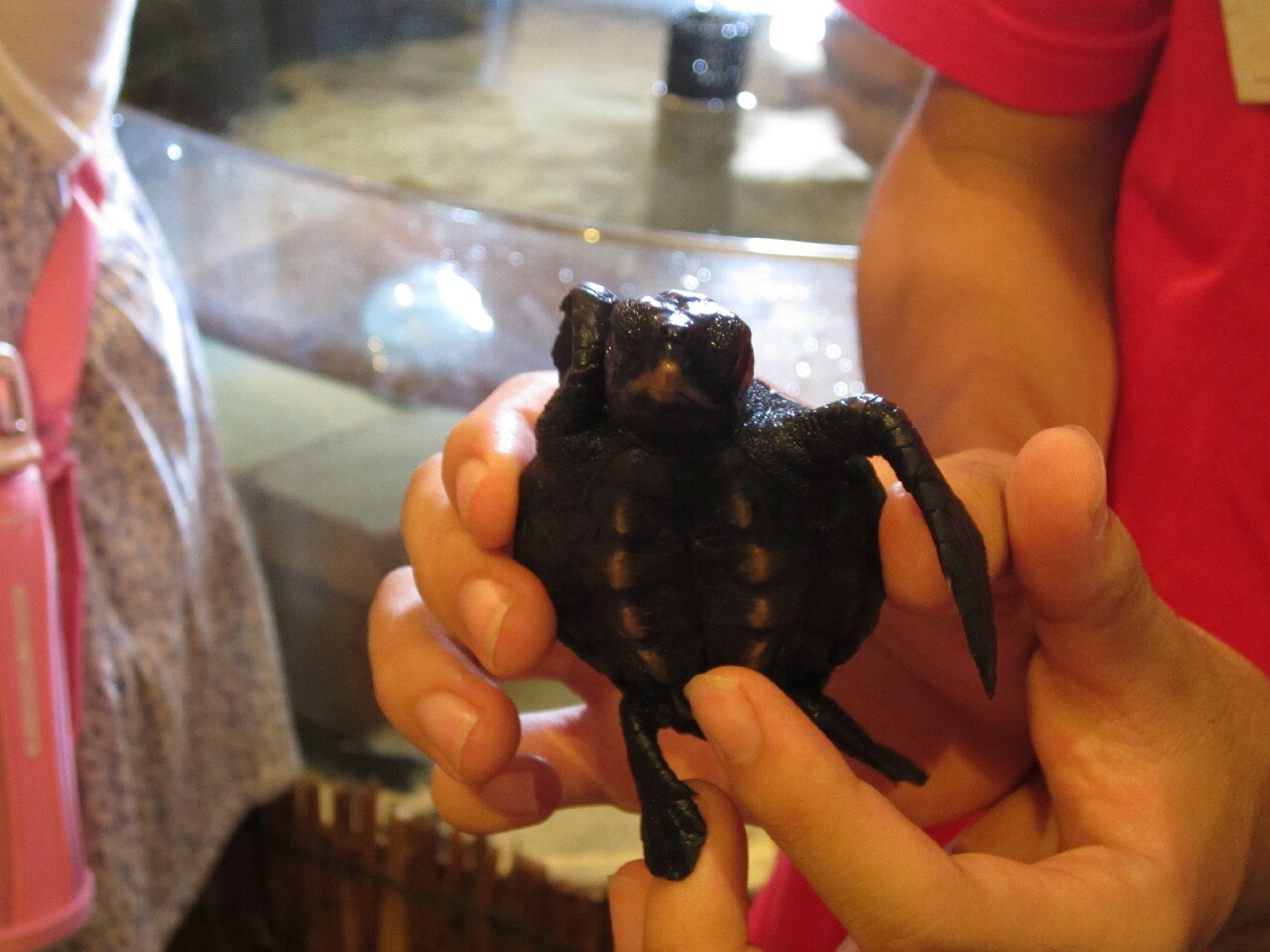 無事放流を終えて研究所に戻ってきて、待ってました!おさわりタイムです(笑)ほんとにさわり放題写真撮り放題です。研究所の学生さんたちも「¥300(入館料でこんなにべたべたさわれるとこありませんよ~」と言ってたwそれにしても、彼らのカメに対する愛をひしひしと感じたw好きなんだなぁ。きっと、彼女よりカメ、嫁の出産よりカメの産卵なんだろうなぁ・・・。好きなものを研究できるって幸せだね。