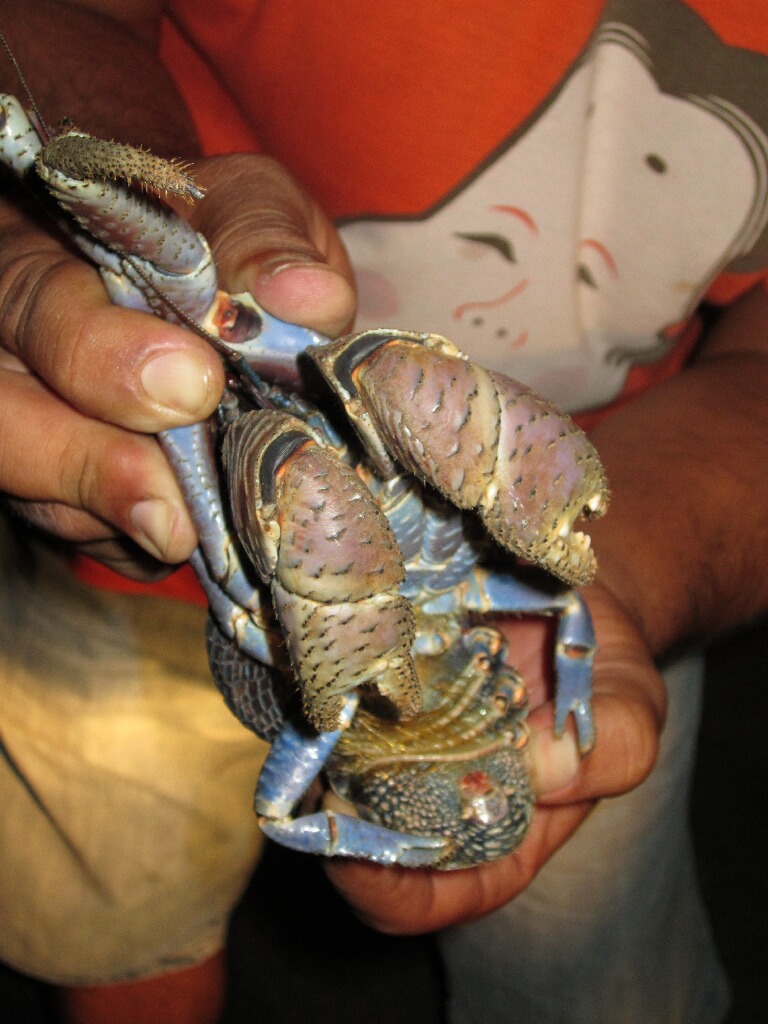 みんなでバンに乗って捜索していると、オーナーがさっそく発見しましたー!ちっさめだけど、ヤシガニ君ですよ!こんなのが道端にいるなんて、島、すげぇ!(笑)いかにミニマムといえど、迂闊に触ろうもんなら指切り落とされますが、さすが達人オーナー、慣れた手つきで捕獲してくれましたww