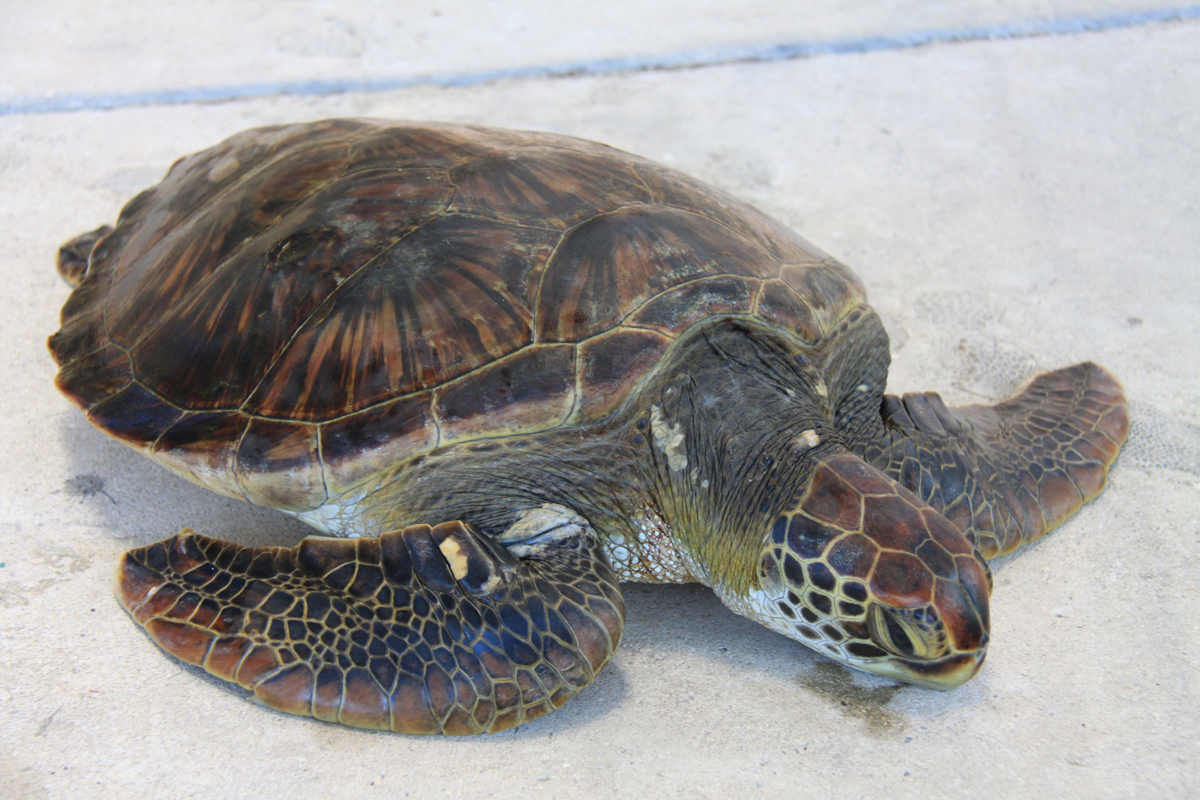 会議室での勉強が終ると、次は外に出てこの日放流するウミガメの身体測定タイムです。今日のクランケ(笑)はアオウミガメ君ですよー。豆知識ですが、ウミガメの中でもアオウミガメは特にキレイ好きらしく、いつもヒレで甲羅の掃除をしてるんだとか。たしかに、研究所にいた子たちも常にヒレで甲羅をサッササッサ磨いてたわ!