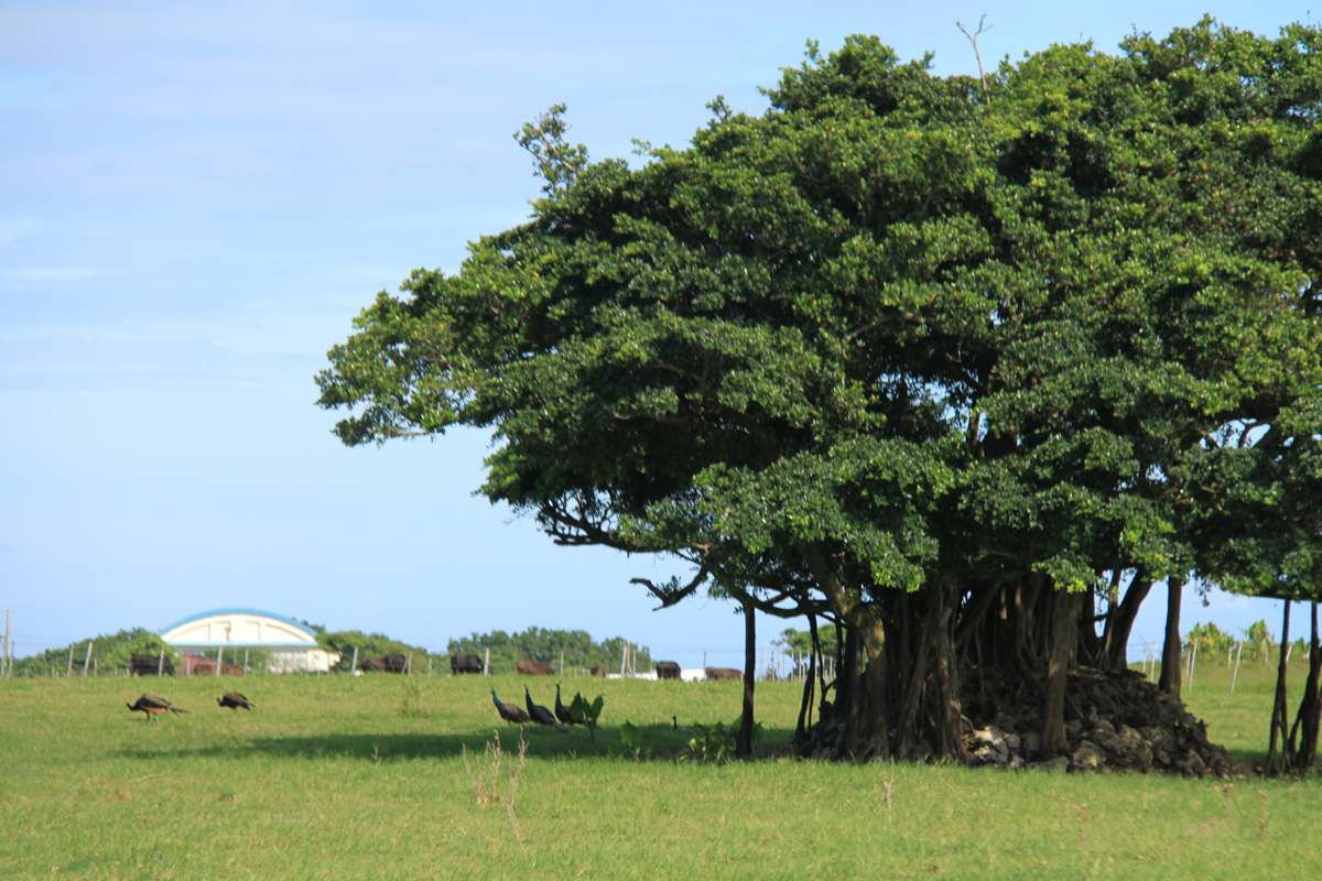 この黒島、実はクジャクがたくさん生息してるんですな。なぜかというと、その昔、八重山のとあるリゾートホテルで飼育されていたクジャクが島から飛び出し、偶然降り立った黒島の環境がクジャク達にあったらしく、そこで繁殖・野生化して今にいたる、ってことらしい。しかしながらこのクジャク、農作物を荒らしたり、八重山の固有種の生物を食べてしまうなど、かなりの悪者というか、害獣ですwなのでここ黒島では駆除の対象になってます。「食べたらいいんじゃないですか?」とオーナーに聞いてみたところ、肉がマズイとかwうーーん、あんまり美味しそうじゃないわなクジャクって・・。島内をサイクリングしてると、画像のように木の下で群れてる姿をよく目にしますよ。なかには幸運の白いクジャクもいるらしいけど、幸運だろうがなんだろうがそこは害獣(笑)本人達も、害獣扱いされてるってことをわかってか、人の気配感じると一斉に逃げ出します。近くで見ようと追い掛け回したけど、全然ダメだった・・・ハァハァ・・・(なにやってんのこの人)。