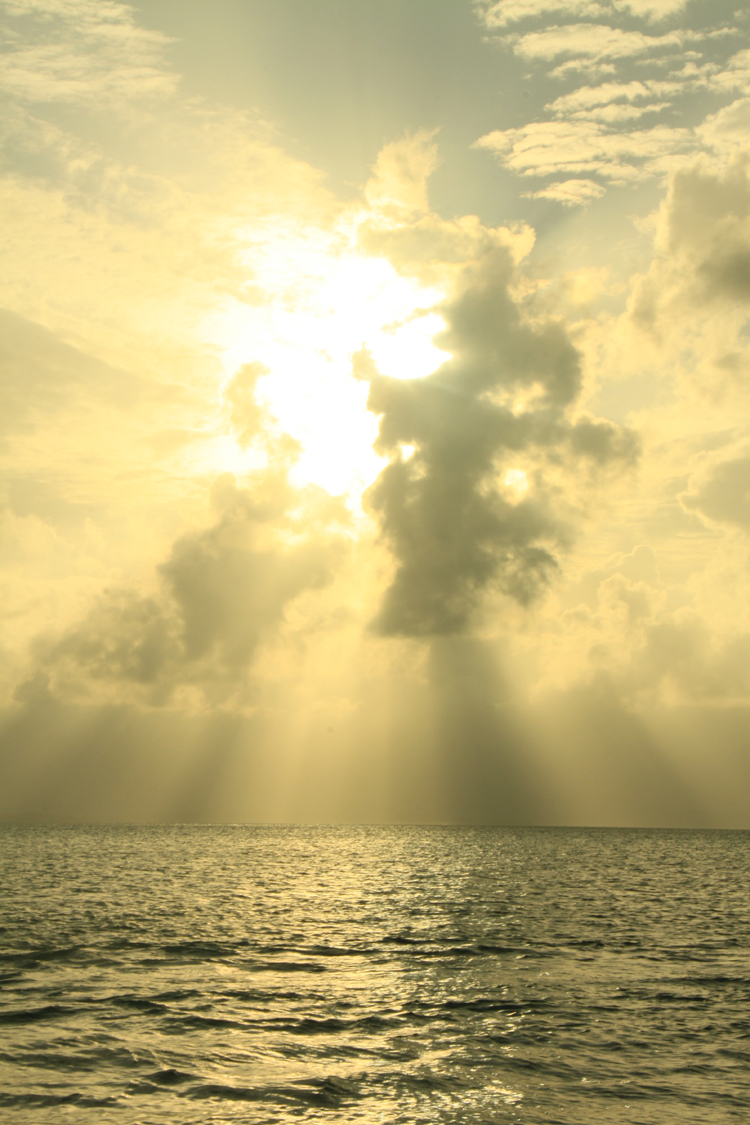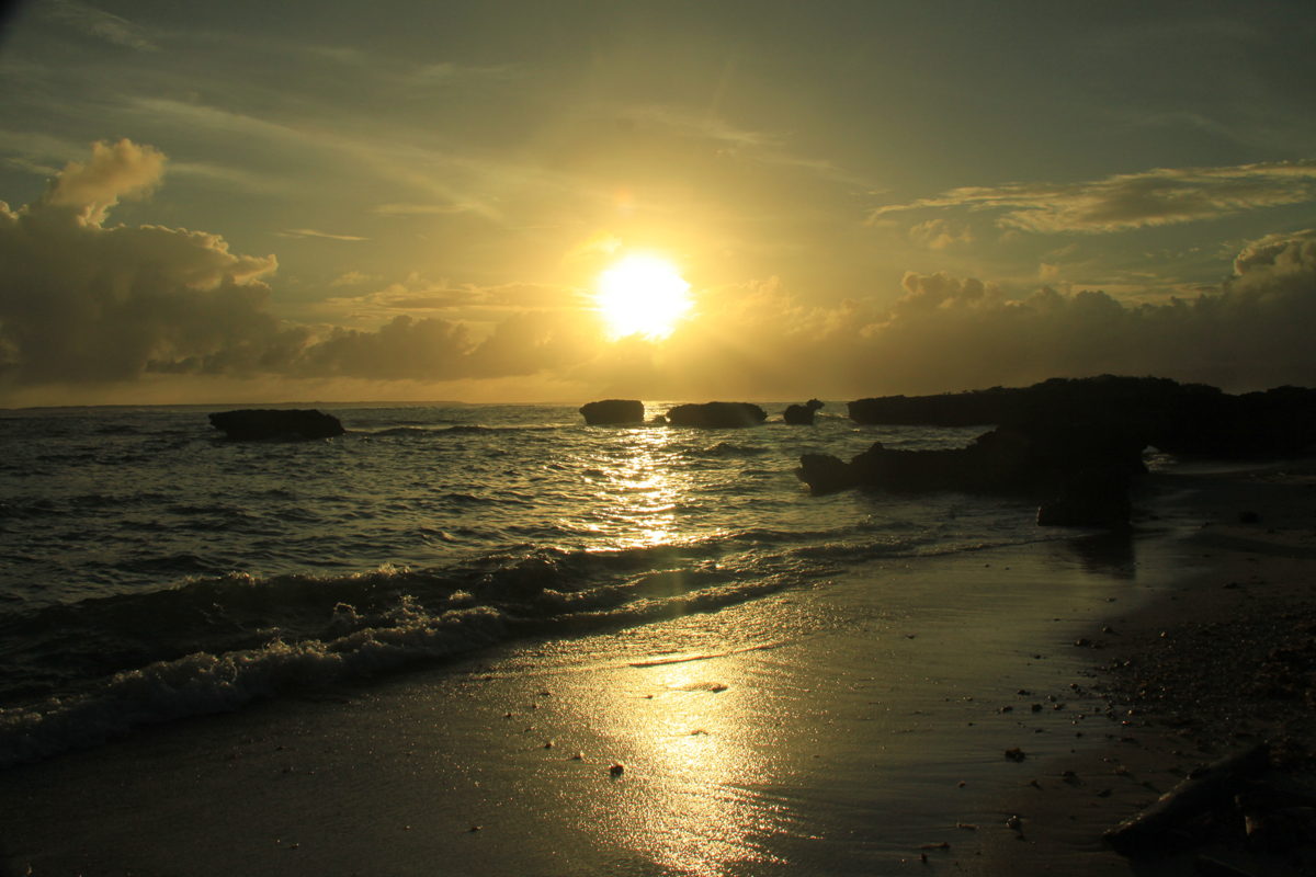 夕方、夕日見物&シーグラス拾いに、昼間ウミガメを放流した、集落近くの保慶海岸まで散歩に行きました。昼間は潮がひいてたけど、この時は完全に満ちてました。
