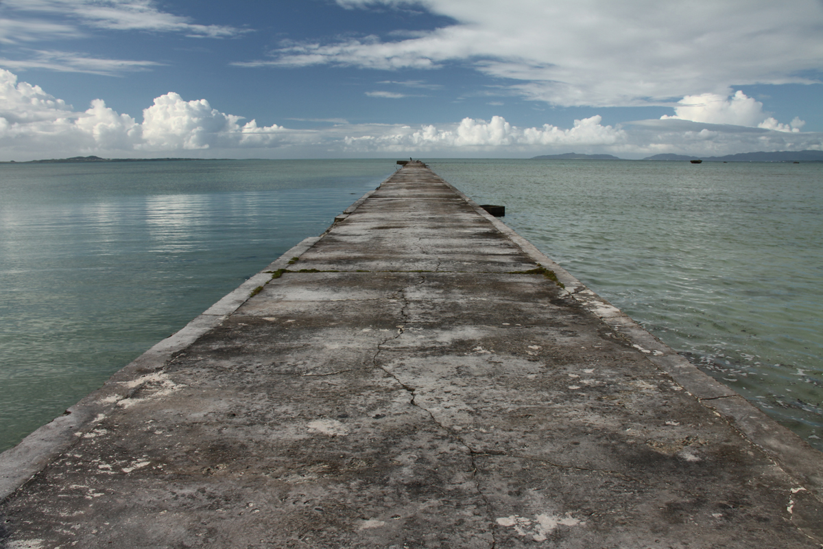 黒島の見所といったら、黒島研究所、仲本海岸が有名ですが、個人的にツボスポットだったのが、この伊古桟橋。黒島港から東にチャリで15分くらいこいだところにある、以前使われていた桟橋です。はじめは木造だったけど、台風の被害にあい作りなおされたものなんですが、それもまた台風の被害に何度もあいボロボロになってしまっている。・・・・廃墟好きにはたまらんッ!(グッ)www美しい景色の中にある廃墟って、儚いというか諸行無常というか、一種のロマンがある。特にこの橋の朽ち方がいいんだよな~。先端の方へ行くと大きく崩れている部分があって、端っこまで行くのはけっこう危険ですよ。で、その朽ちてボロボロになったところにカニが住んでる・・・・ああっ!イイっ!!(変人注意)この真ん中のヒビの入り具合といいモルタルの劣化部分の色のまだら具合といい・・・イイっ!!!