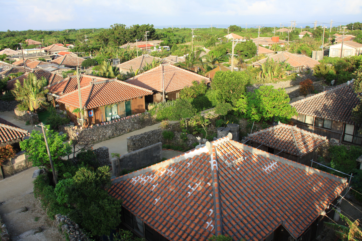 夕日見た帰りに、集落の中にあるなごみの塔に登ってみました。なごみの塔とは展望台みたいなもので、竹富島で一番高い建物、ということにはなってます。が、展望台というにはあまりにもおそまつ(すいません)というか、なにこれ、ちょっと背の高い脚立じゃんw的なものです。しかも、階段部分は幅45cm傾斜が60度で一番上の展望部分も人1人立ったらいっぱい、という恐ろしい建造物なんです。なので、子供、お年寄り、高所恐怖症、閉所恐怖症、スカートの女子は登るのは絶対的にヤメることをオススメします(笑)いや、ほんとに。階段登るっていうか、両方の手すりにしがみついてよじ登る感覚だたアルよ(死)降りる時はもっと恐怖w上からの景色はいいけどね(上の、集落の全景写した写真はここで撮ったやつ)。日中はこの塔に登ろうと、すっごい行列が出来てたわー。これ老朽化したら冗談抜きに事故起こりそうで怖い(汗)。
