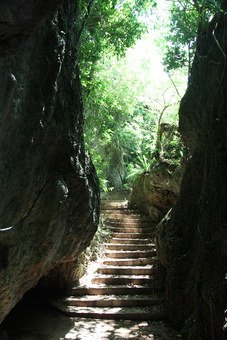 鍾乳洞の出口にある大きな岩のアーチをくぐると、海に面した散策路になっていて、こんな風な石の階段をのぼって海の方へ行けるようになってます。なんか、ジブリに出てくるような景色w