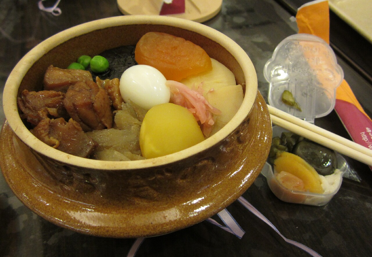 ・・・・・・・えっと・・・・まずね、まずね、釜飯自体がぬるかったのよさ・・・・。でね、でね、とにかく全体的に味が薄いのよさ・・・。老人向け?そしてね、なぜかアンズ(うずらの卵の斜め上のオレンジの物体)が入ってて、これが甘いのにあぬくもってて、ギャアァー!ってなるんよね・・・。ぶっちゃけ漬物も口に合わなかった・・・・(死)