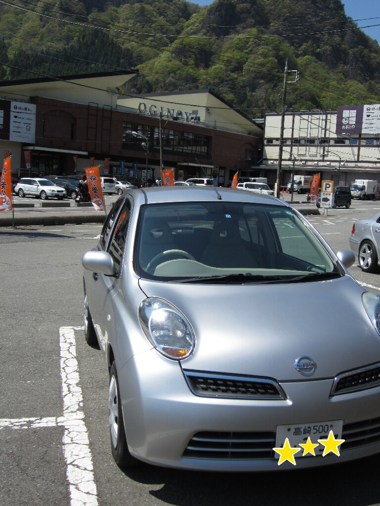 本店がどこにあるのかわからんかったのでとりあえず手前のドライブインの方に行ってみた。あ、写真、今回Rent a carしたマーチだす。デミオ君期待してたのに出てきたのはコイツだったゼ、チッ!相変わらず坂道を登らない駄車でした(酷)。一応、高崎ナンバーなんてそうは乗らないだろうから記念におぎのやと一緒に撮ってみたw