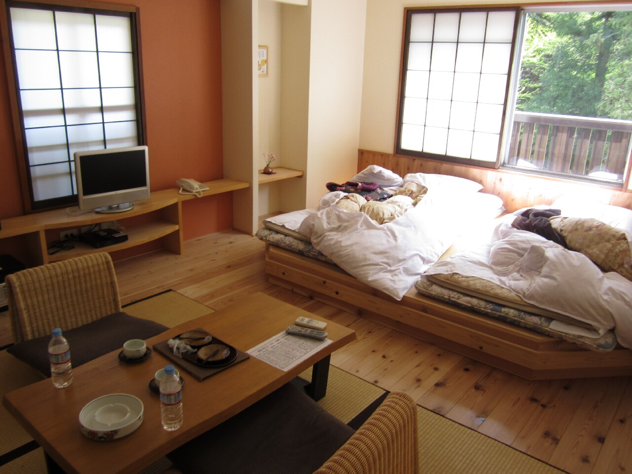 部屋が微妙に使い勝手が悪い。鏡無いし、洗面台激小で水ハネ凄いし。あと座椅子が中途半端な高さで気になる。