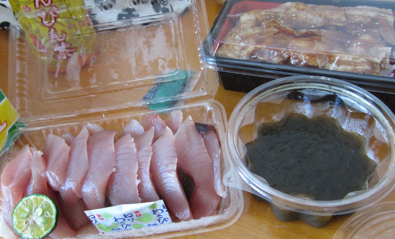 モズクとマグロは離島ターミナルの前にある鮮魚屋さんで買ったけど、ここのモズクが激ウマでわっちのモズク感変わった(笑)この店のダシがうまい~!本土に戻ってきてからもしばらく他のモズク食べれんかった・・・。あと、マグロ。これ上げ底じゃないよ、モリモリに入って¥500也。マグロを半分残すという暴挙をしてしまった(死)沖縄はマグロが安く食べれてほんと最高ですだ。