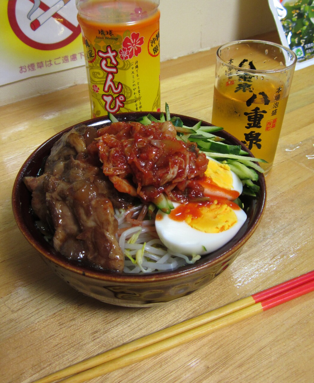 韓国冷麺の方は、前日食べ切れなかった切れ端を焼肉のタレ付けて炙って上にのっけてみた。なんたる贅沢(死)キムチと合うわぁ~(涙)