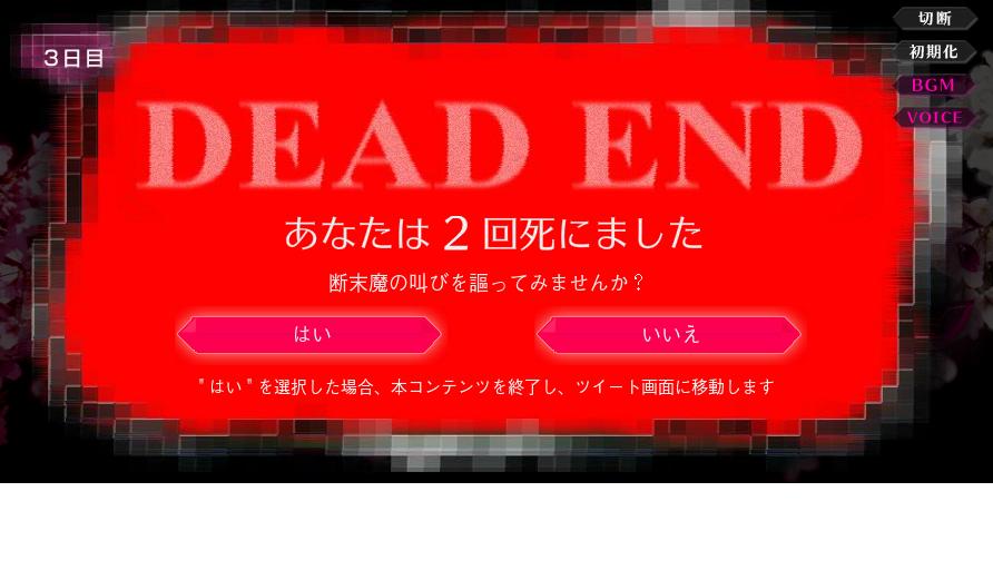 このゲームが開設されて1週間経とうとしてますが、あちこちで攻略サイトなるものも出来てるようですねー。一体どう攻略しろと(死)中にはどっちの選択肢選んでも死ぬ、とか怪情報が・・・・理不尽過ぎるww
