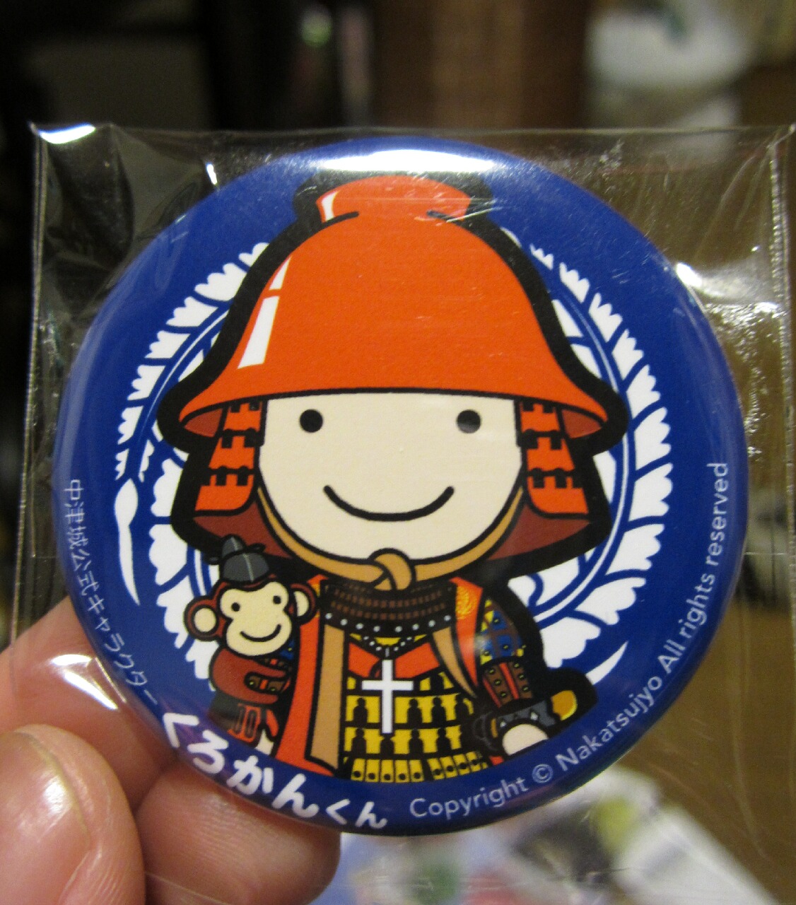 んで、足を延ばして中津にからあげ目当てで行ってきたぞー。ついでに中津城も行ってみた!大河効果ですかね!なんか人が多かったwいつ行っても人いないから別荘感覚の城だったのにwwそして、ありました・・・。大河に併せて作られたであろうマスコットキャラの「くろかんくん」グッズ。くろかんくん自体は居なかったけど、3月3日がお披露目とかでグッズも数種類ほど販売してましたー。おーい、あかんべーはどーしたー?大河に便乗ならあかんべーでいーじゃんよー。あかんべーがキモくてキャラとして定着せず代わりにおっくんを作ったけど大河が決定したから急ごしらえ感が満々なんですが。(毒吐き中)正直、こんなゴテゴテしたデザインのマスコットよりキモくてもシンプル且つショッキングなデザインのあかんべーの方がよかった、と思うのは私だけじゃないはず!カムバック!あかんべー!とかなんとか言いながら一応旅の記念にバッジ買った(笑)