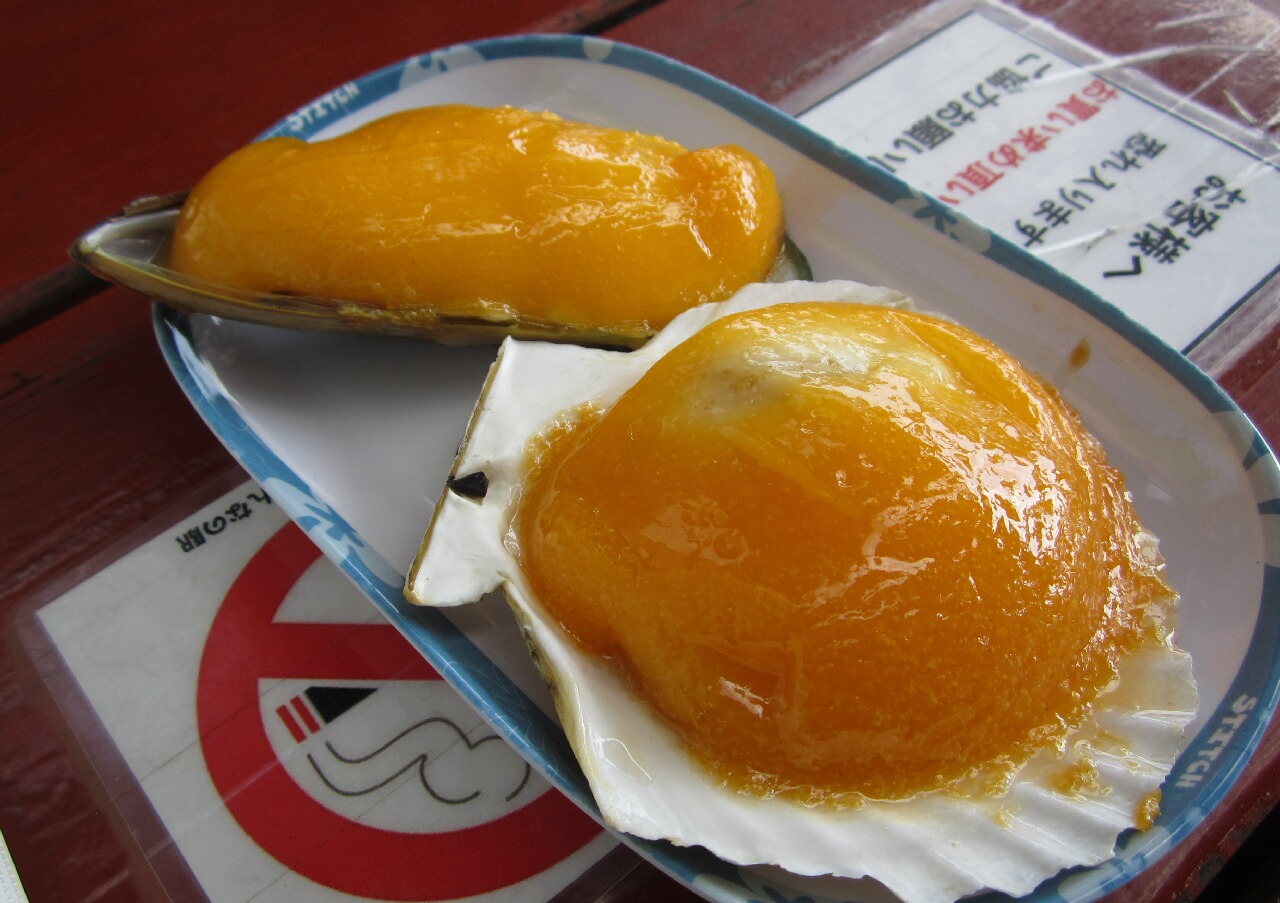 奥のがムール貝で、手前のがホタテ。どっちも¥100とか¥200とかかなりお手頃でおやつにちょうど良いね。他にも伊勢海老なんて贅沢なものもあるよ。