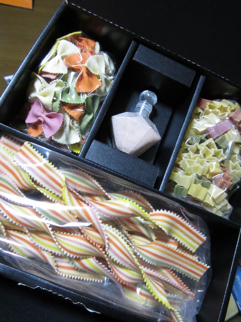 んで、画像は引き出物なんすけど、こんなレインボーでパーリーなパスタがあるのね!開けてびっくりした!しかも岩塩付き!せっかくレインボーなんでクリームソースかにんにく系が合うだろうなー、ってか使うのもったいないw