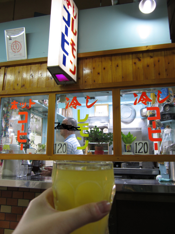 ぐるぐるぐるぐる、那覇の迷宮を散策というか、なかば迷いながらなんとか公設市場に着いたんでちょっと一息。公設市場の端っこにあるジューススタンドで、かれこれ50年以上やってるそうです。んでここのうりは「冷やしレモン」。といってもレモンじゃなくてヒラミレモン(シークワァサーのこと)ね。一杯¥120で結構どっぷり入ってます。これが、すんげー美味かった・・・・。迷宮から抜け出して疲弊した心と体に染み渡る酸味と甘み・・・・。すっぱ過ぎず甘すぎず絶妙なのよ!店のおいちゃんの人柄が出てるようなー。コップも年季入ってていいかんじなのよー。店の前にベンチあってそこで飲んだけど、買い物にきたおばぁとかおじぃばっかりで観光客おらんかったな・・・。結構有名なんだけどねこのお店。次からも那覇に来たときはここ、ぜひ立ち寄りたいな。