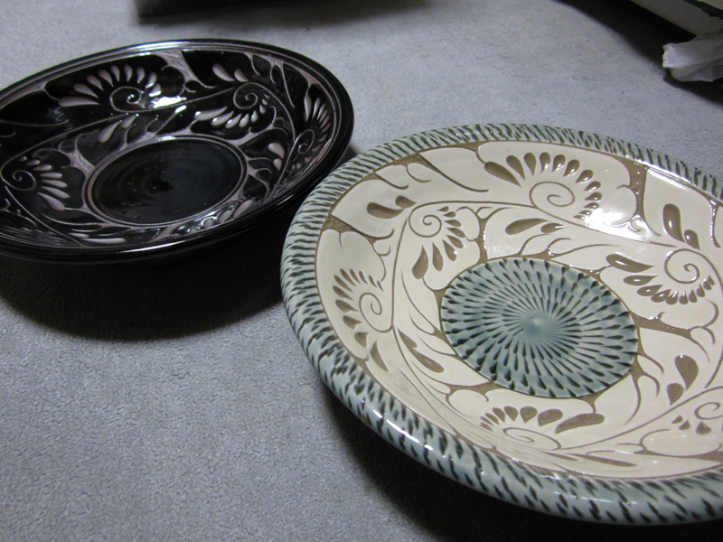 あちこち見て回って自分なりのツボだったのが「育陶園」さんです。ここはネットでもしっかりとしたHPあったりシーサー体験とかのPRもしてるんでわりと有名な工房かな。んで、育陶園さんといえば、この彫りの唐草柄。他の工房でも似たようなものはあっても、これに関しては育陶園さんが一番ですね。実際工房の方と話してたらこっそり「この技術はうちが日本一ですよ」と言ってた(笑)日本一、というかやちむんは沖縄にしかないから事実上世界一、だよね(笑)でもほんと、色といい彫りの細かさといい、ものすごーく繊細で素敵だわー。写真の黒い方、素焼きの側面の表情がイイんだよー。マグカップとフリーカップと7寸皿2枚も買ってしもた!結構いいお値段なんだけど、それは陶器市、値段交渉できますw交渉しなくても安くしてくれたりサービスで一輪挿しくれたりと、やっぱこういうイベントで買わないとね!育陶園さんのファンも全国にいるみたいで、私が買い物してる間もいろんな人が遊びにというか買い物に来てたなー。わたしもファンになったんでまた来ます(笑)