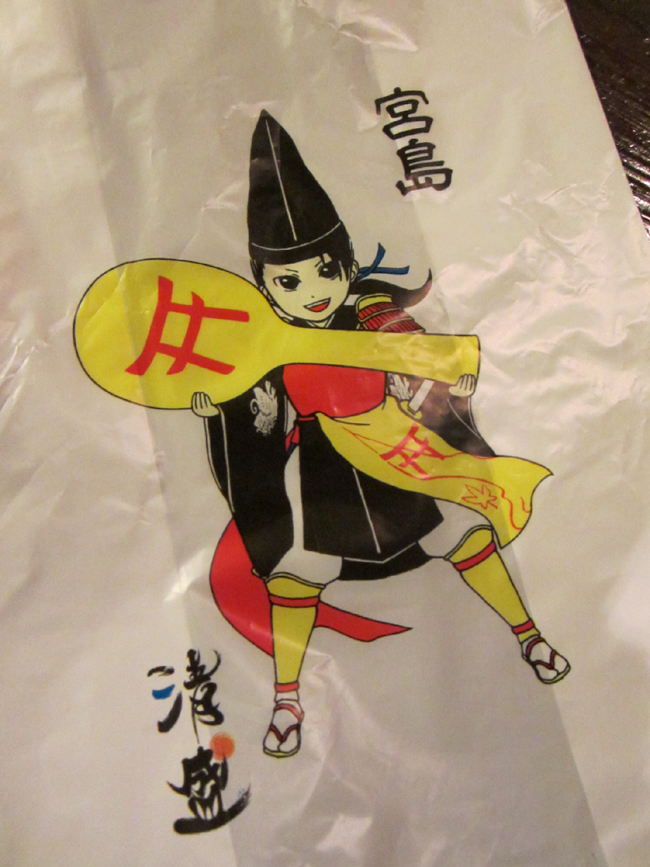清盛くん、メインポーズが上のやつだけど、ネットとかで調べたら他にもたくさんポーズあるんだね!(棒読み)横のしゃもじ持ってるやつは旅館の売店で買ったら入れてくれる袋でした。・・・・・・ちょっと待て・・、島内中の店がコレに土産入れるのか・・・・・これじゃ宮島港がコミケ帰りの周辺駅状態になるじゃないか・・・(爆)!!こんな萌系袋みんな抱えてさ!!(死)やめてよッ!!あわわわ・・・・神の島が萌に汚染される・・・・。そう言いながらも、ネタ的に面白いので清盛くんグッズいろいろ探しながら散策しましたー。自分用には差し障りのないマグネットだけ買うた(笑)