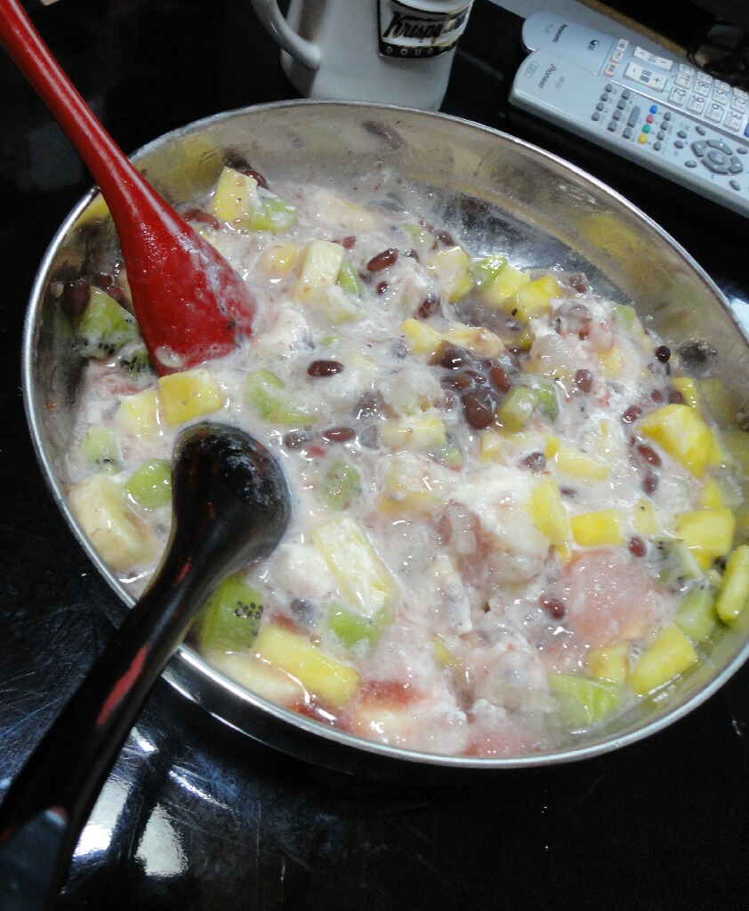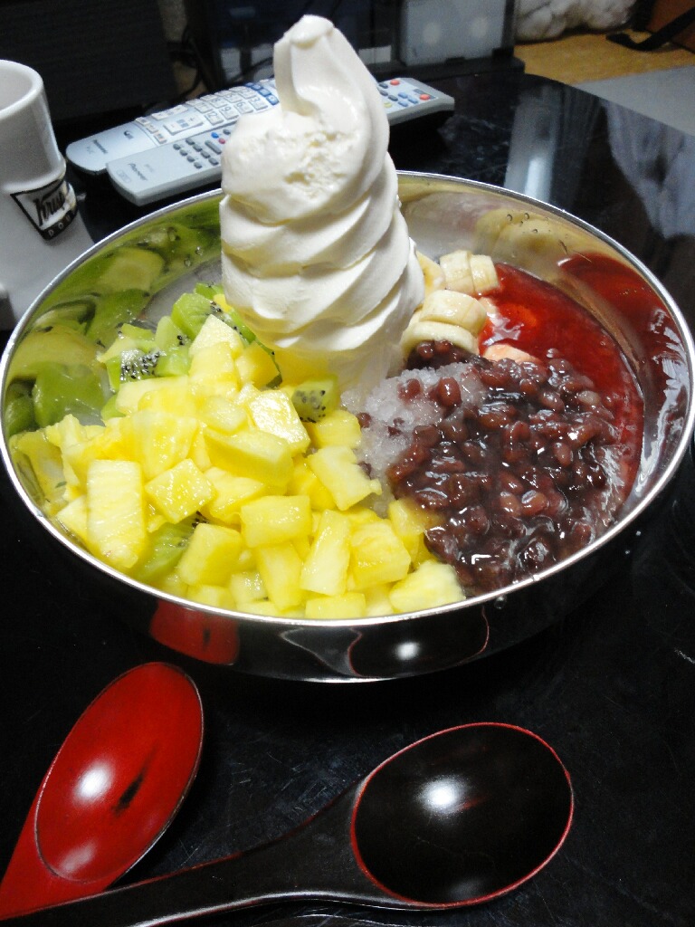 そんな韓国スイーツつながりで。先日おとなりの国の夏の名物パッピンス作ってみただよー。どうじゃーかなり本格的じゃろーひひッ。アイスベリーのパッピンスを模範にしてみたけど、ひとことでパッピンスちゅーても店によってみんな形状違うもんねー。屋台のなんかはあずきと氷だけの沖縄ぜんざいみたいなやつだったし。要は、この2種類をベースに季節の果物やらもちやらバンバン入れればいいんですな。ただ、混ぜくって食べることを考慮して、甘いものばっかじゃなくて酸味の効いたものも入れたほうが、甘みと酸味のハーモニーがすばらしくなりますだ。