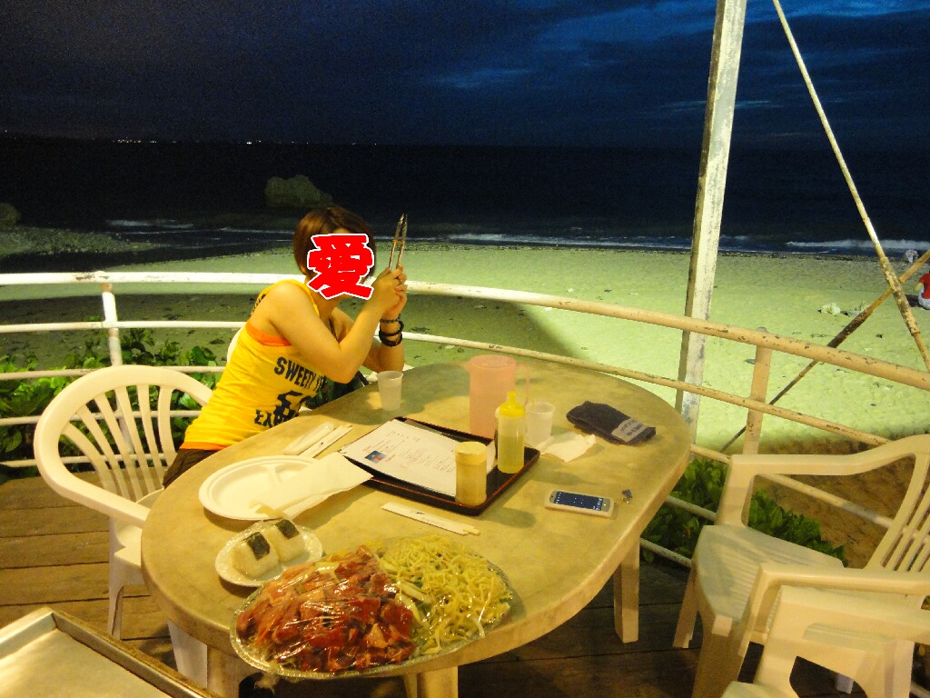 そして、おまちかねのビーチパーリィタイムですよーヒホー!このホテルのうりのテラスでBBQディナーです。見よ!テーブルに置かれたモリモリの食材を!これ2人前ぞよ!(笑)海風にふかれながら、波音を聞きながらBBQ・・・・おおぅ最高すぎる・・・・ww肉硬かったけど・・・。ホテルの人がなんかものすごーく懇切丁寧にBBQのイロハを教えてくれたけど、BBQ奉行かなんかかあの人?(笑)しめのやきそば麺が沖縄ソバの麺だったりと、沖縄らしいBBQが楽しめますよー。ここレストランの洋食もおいしいけど、せっかくなんでBBQをおすすめしますねー。