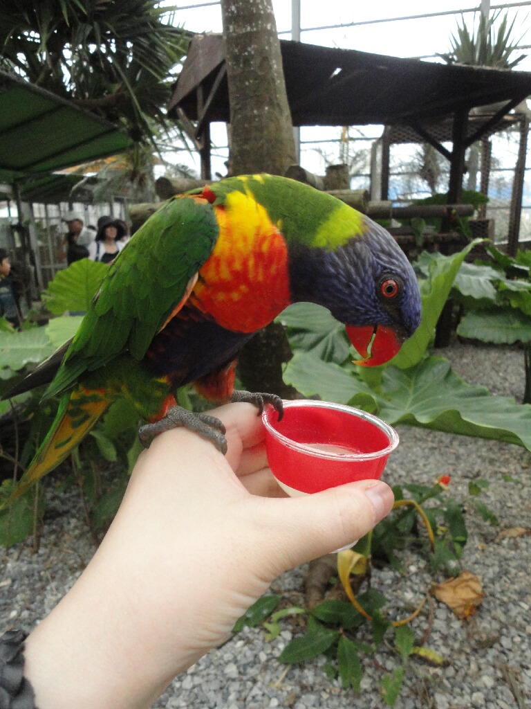 内容としては、沖縄特有のトロピカル空間で南国の動物とふれあえーる、トロピカルフルーツを食せーる・・・・・かなりベタです(笑)ベタなりに楽しめるけど。早速、派手なインコちゃんにえさやりです♪・・・・・しかーし!!このインコ共、かなり性悪で、えさ持ってると見るや頭上から襲ってくるわ、独り占めしてるから追い払おうとしたら喰いついてくるわ・・・・おまえらキライ!(怒)頭上からウン〇たらしてくるやつなんかもいてまさに危険地帯でしたww他はヤンバルクイナもいたなー、初めてみた生のクイナー。警戒心強くて逃げ回ってたけど・・・。んー、動物と触れ合うんならネオパークオキナワの方が数倍敷地も広いし面白いなー。