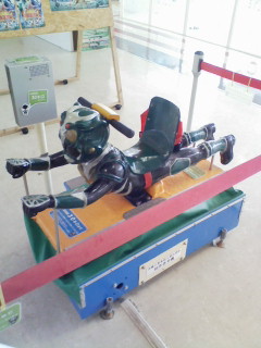 ←コレ、MOS(略ね)の前に置いてた、まぁよくあるガキんちょ用乗り物なんですが・・・・・・。マブヤーの背中に乗るて・・・・。誰も乗ってなかったし、いくら旅の恥は掻き捨てちゅーても自分が乗るわけにはいかんかったんで、どういう動きするかはわかんなかったが、マブヤーのテーマ曲にあわせて縦揺れなり横揺れなりするんでしょうねー。実際マブヤー飛ばないけどwあれですね、これは小さなお友達用なんで、是非ともガナシー様の方は大きいお友達用のお姫様抱っこ使用で作ってほしいものですね!ってか、ご当地ヒーローでここまであるのって凄いよな・・・・(感嘆)どこまでいくんだマブヤー・・・・・。