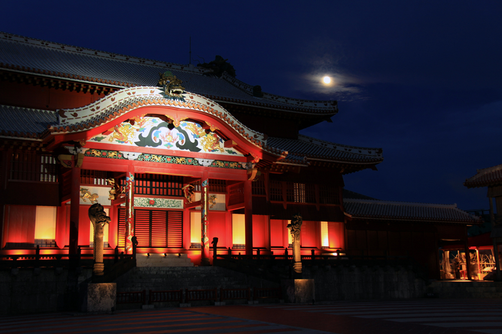 夏の間は夜間開園してるんですな、首里城さんは。なのでライトアップめあてで三脚かついで登城させていただきやした。