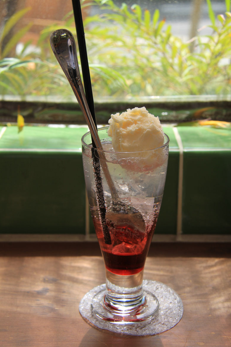 んで、その日気合と根性でこんぴらさんの奥社まで登って下山して食べたソーダフロート。温泉街にある小洒落たオープンカフェなんですが、実はテーブルの下が足湯になってるという。いやぁ、至福の時だったなぁ~。味はーまぁ、普通(笑)