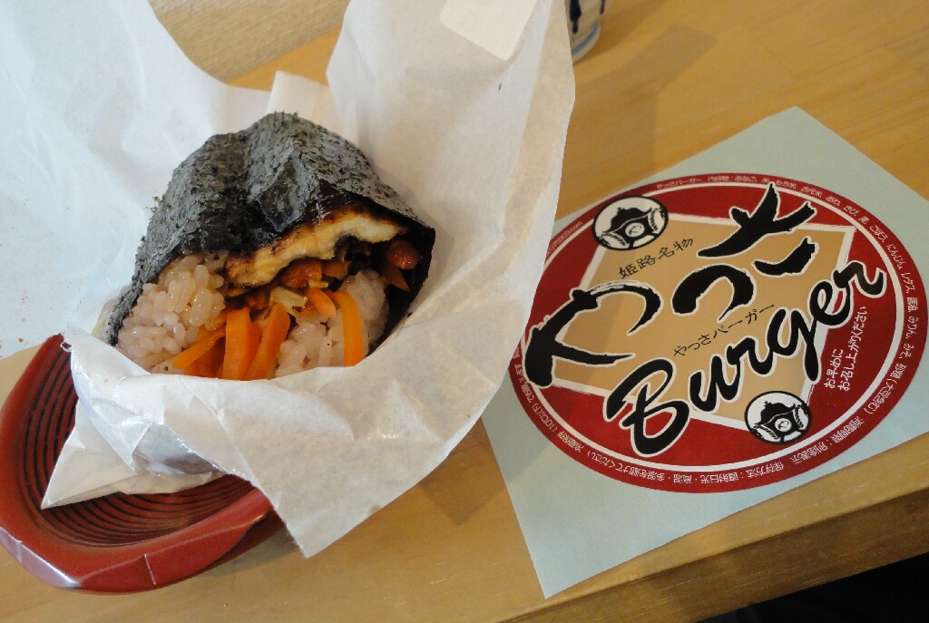 翌日足を伸ばして行った姫路で食べたやっさバーガーさんの姫路城お隠れバーガー(だったかな?)。このお店、噂の官兵衛バーガー売ってるお店です(笑)お隠れバーガーは姫路城の修復期間だけの限定販売らしいです。だからお隠れ。ライスバーガーみたいだけど、どっちかっていうと具沢山おにぎり寄りかな。あなごとマヨであえた野菜が入ってるんだけど、なんだろう、これ、旨かった(笑)