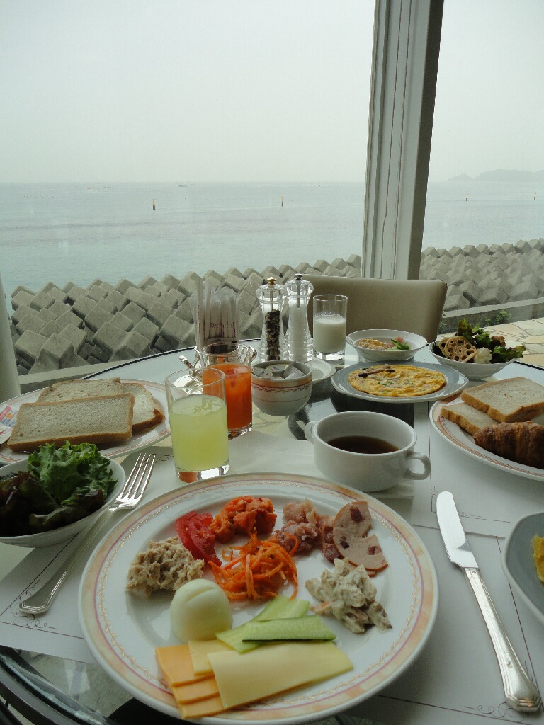 翌日のホテルの優雅な朝食でござる。晴れてたら青い海を眺めながらだったかもしれないけどあいにくの空~。
