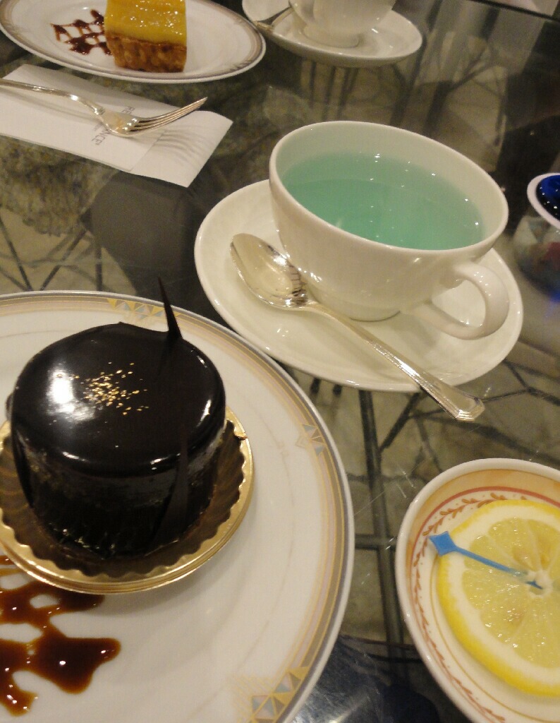 夕食に満足できんかったんで(笑)食後に行ったラウンジのケーキセット。ブルーマローとかいうハーブティーで、レモンを加えると一瞬ピンクになるというおもしろティー。でもピンクになるの一瞬だし香りも味も特にないんでおさ湯飲んでるみたいだった・・・・。手前のチョコケーキは中にすだちが仕込まれてて意外と美味かった。ルッネサンス系列のスイーツって地元の素材を美味しく使ってていいなぁと思う。
