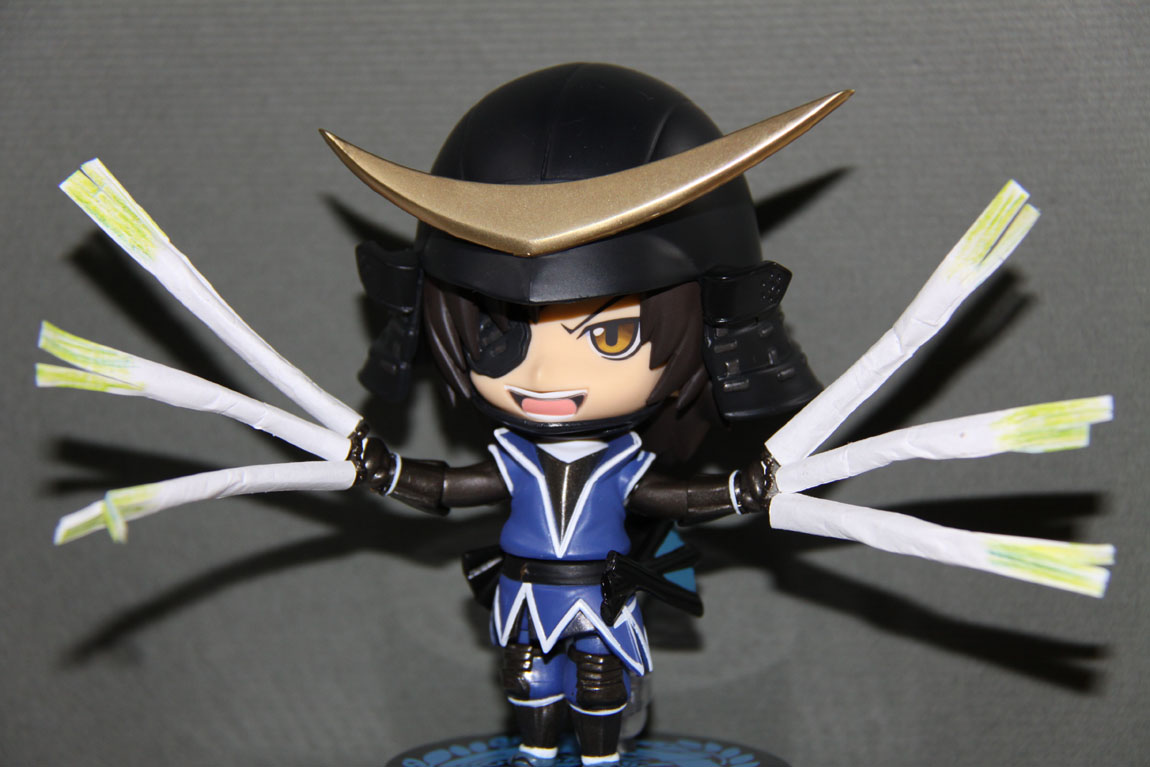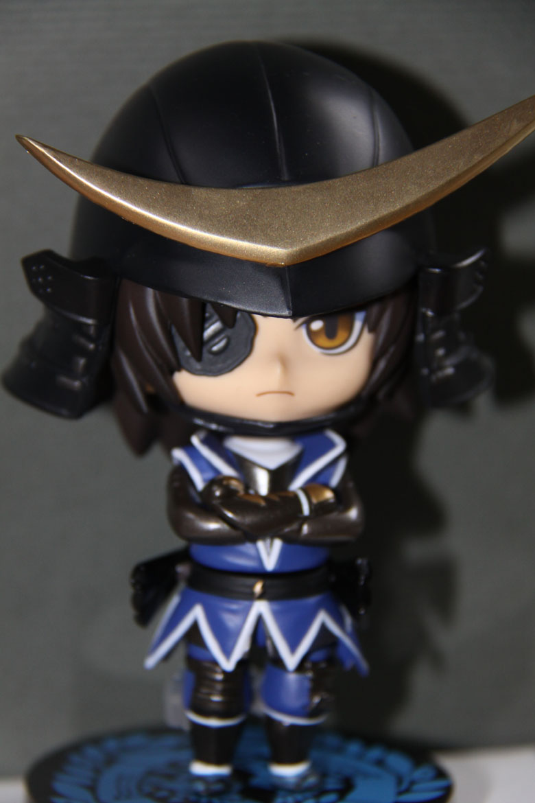 あと、難点というか致命的な欠陥なんですが、これ、立たない・・・・自立して下さい政宗様(笑)レビューにも書いてあったけど、台座が根性なしなうえ頭が超重いからものの1秒でぶっ倒れるんですが・・・・・。なぜこんな台座にしたァ!?しかも兜かぶせたらずれるからリアルに「あなた兜がずれて見えちゃってますヨ?」(ザビー教徒)状態になる(死)。固定板かなんかは自分で作ったほうがいいなこりゃ!それ以外は細かいとこまでよく出来とります、さすがねんどろいど!チェゴ!うっかりフィギュア愛好家の道に走りそうでこわいわwww