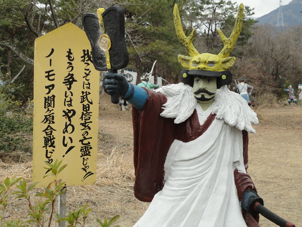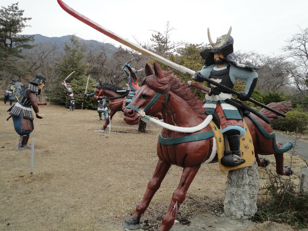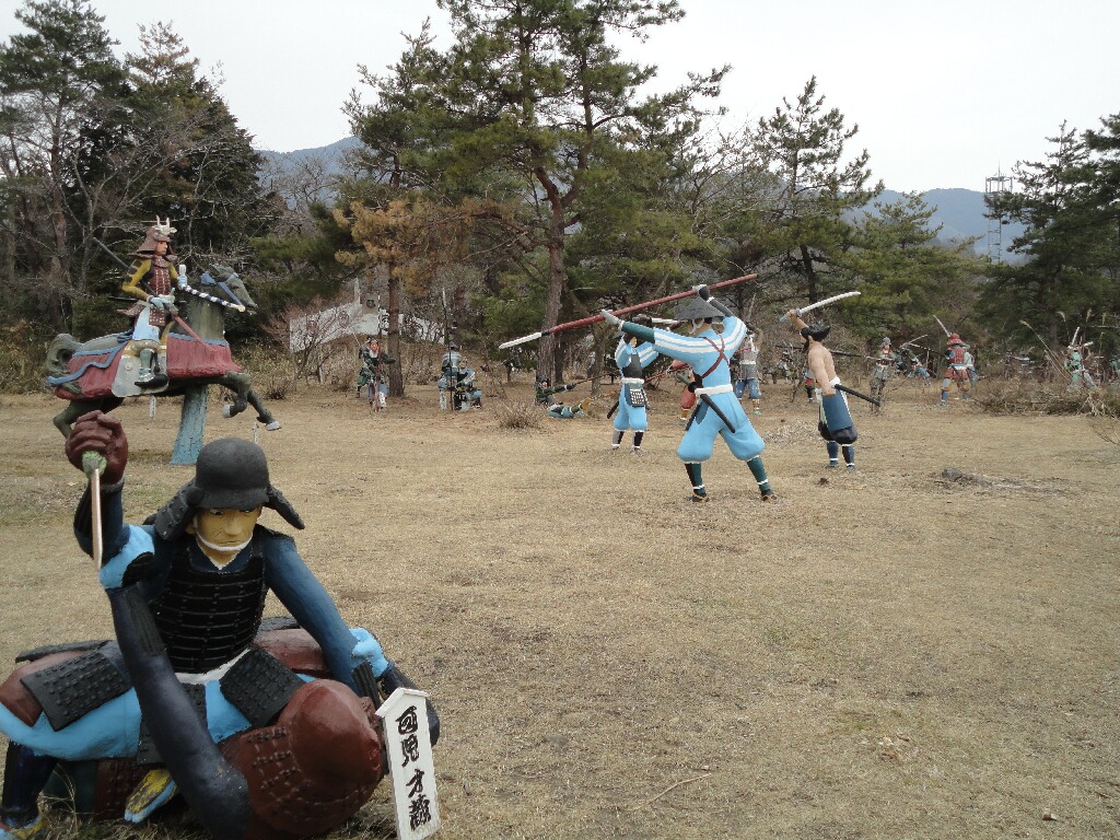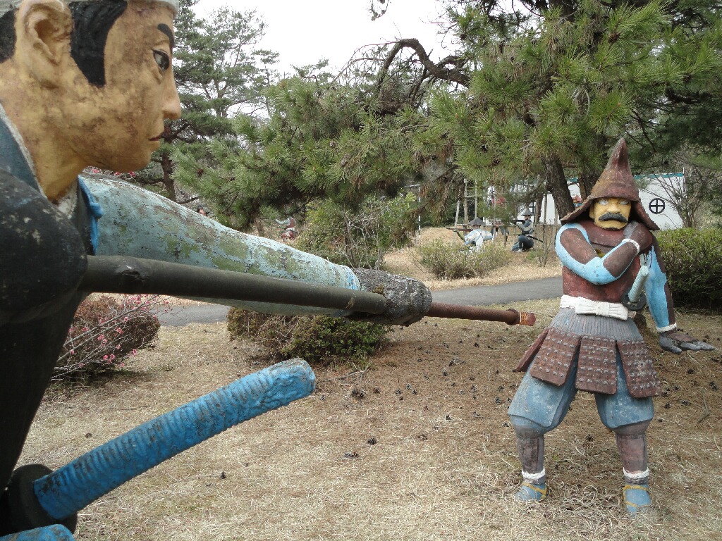 再現してるってことで、一応陣の位置が決めてあったり、ひとつひとつの人形が誰々って書いてあったり、有名エピソードを再現してたりするんですが、はっきりいって超シュールですここ。チケット買って入園してすぐに顔はめとか実際に乗れるコンクリの馬とかあってテーマパークっぽいんですがそこから50m先は異次元空間です(笑)1600年にタイムスリップしたみたい!!、とかそんな夢のあるもんじゃなくて、言葉に言い表せないカオスな空間になってます。