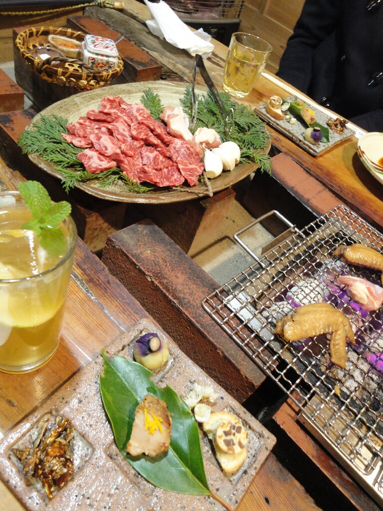 囲炉裏焼きのお店で基本コースメニューのみなんで、今回は一番高い(といっても¥4,200)の牛と鶏のミックスコースを食したゼ☆