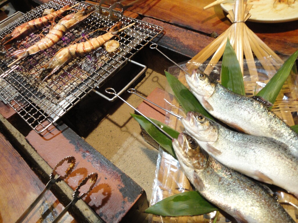 前菜から、ここはただの囲炉裏料理屋じゃない感ぷんぷんの素晴らしいお料理だったわ!なんでもシェフは以前フレンチシェフだったとか。なるほど、和食とフレンチが上手く融合してた!テリーヌとかあったし。んで、焼物は鳥皮の味噌付け、手羽先、鳥身、牛と出たけど、この鳥皮が美味かった!ちょいピリ辛なんだけど味噌の甘みと丁度あってvそれから里芋ときのこのホイル焼き(これも美味かった!)、大海老(プリプリ!)、ヤマメの塩焼き(超新鮮、生きとる!)と山海の幸がこれでもかとどっかんどっかん出てきますよー。その合間にさっぱりした小鉢も出てきて、全体のバランスがすっごい絶妙だなーと感動した~。もちろん味付けはどれも最高vv