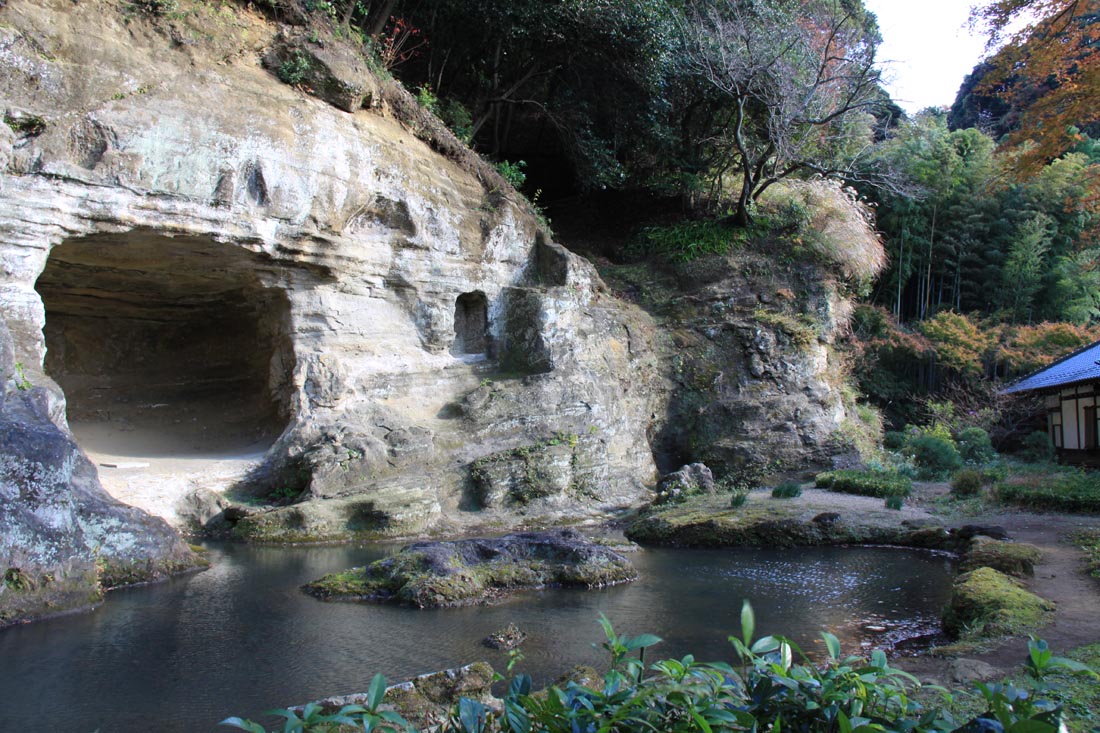 そして昇り切った先にはこぢんまりとした本堂とその奥にちょっと不思議な庭園があります。この庭園、岩山と池からなっていて、岩肌に空けられた大きな穴が不思議な景色を作ってました。こういうお庭ははじめてだなー。なんというか、非現実的。あと、ここのお庭には水戸黄門が植えたらしい冬桜もあってちょうど咲いてた!黄門様ここに来たのね!