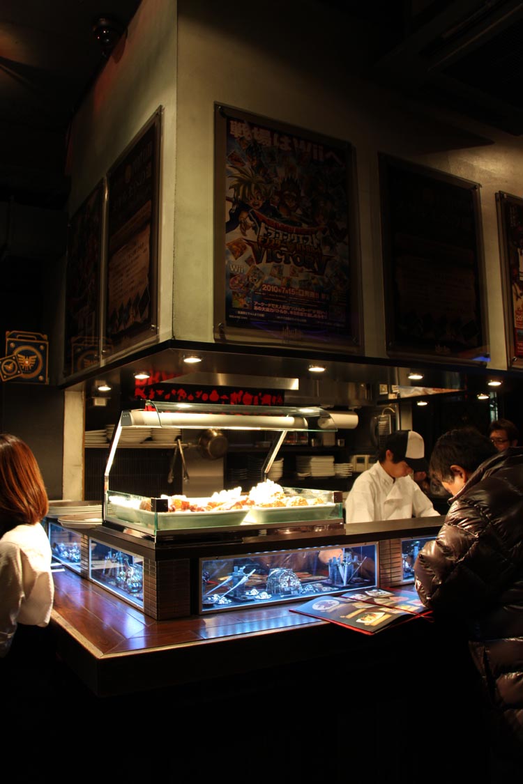 店内はそりゃもうドラクエ一色、BGMもドラクエ(当たり前か)、店員さんも何やらコスプレ(1人だけだけど)。カウンターの中で調理してる人とかウエイターさんたちはいたって普通の店員的な格好だったけど、バニーガールの衣装に着替えろー!って思ったのは私だけじゃないはず。コスプレ店員さんは司会進行役的だったな。時間決まってるんでさっさと注文決めないとあっちゅーまに時間経っちゃうよ!事前に調べておいたからよかったけど。メニューもまぁ、ドラクエにちなんだもの、というかこじつけっぽいのが多かったな(笑)そして全体的に高い・・・・・。田舎もんの感覚だからか、場所柄か、ドリンクメニューに関しては結構フザけた値段だった(笑)あ、著作権もからんでるからか!