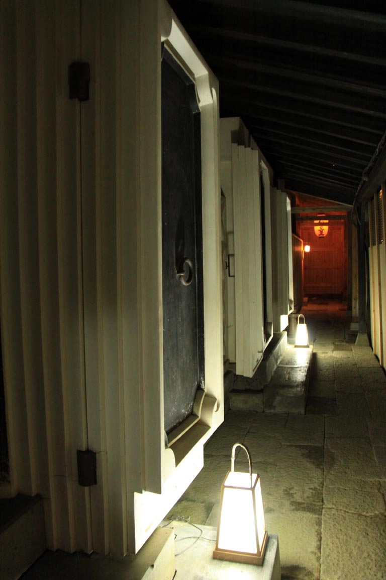 どのお風呂も五感で楽しめる素敵風呂だったけど、私が特にイイと思ったのが、風呂のライトアップの仕方なんですな。最小限の照明と間接照明を使って雰囲気を出しながら主役の風呂釜を美しく照らして自然光も上手く取り入れてあって、ここのお宿は本当にお風呂を大事にしてるんだなぁとしみじみ感じた。蔵湯とかある種の舞台みたいだったもん!お風呂なのに「荘厳」という言葉がぴったりだった!一眼持ってあちこちの風呂誰も入ってないの見計らって写真撮りまくってた気持ち悪い2人組でしたー。(写真撮るために貸切りプレート立ててすいません・・・)談話室のある湯治棟には風呂上りのマッサージイスが置いてある小さな部屋もありました。なんか、おばあちゃんちの縁側の風情だった(笑)館内にあるものはどれもアンティーク、というか東北地方の古い民芸品とかで雰囲気あってよかですたいv談話室ではなにげに伊達さんグッズをプッシュしてあった(笑)あ!あと談話室には田楽とか焼酎が置いてあるんで勝手に飲み食いできる!(してないけど)談話室の前は中庭になってて、夜になると青根御殿もライトアップされてなかなか素敵でしたー。