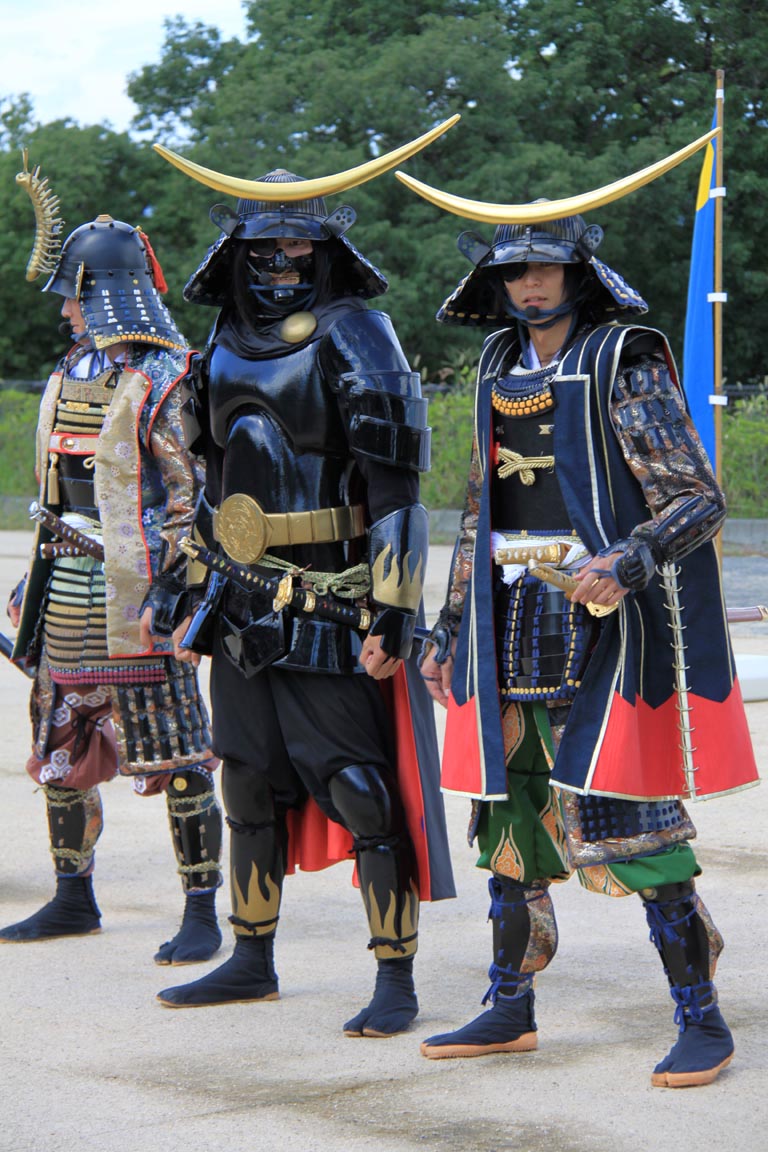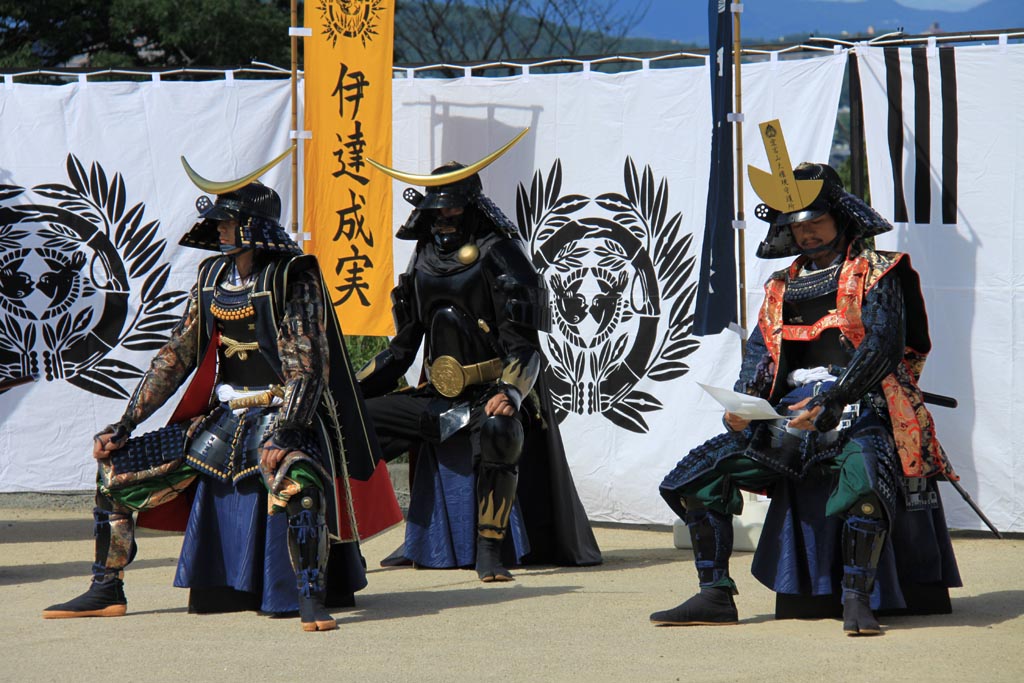 はじめは「仙台市役所の社員がボランティアでやってんのかなー」とかかなり勝手に思ってたけど、彼らちゃんとオーディションで合格した精鋭ですってね!殺陣や歴史の勉強をみっちりした後、この夏発足したそうです。今年の夏は激暑だったんで大変だったろうなーとか漆黒の政宗さん(写真真ん中)なんて顔の4分の一しか出てないから蒸れるだろうなーとかいらんことばっかり考えてしまう・・・。そして、さすが小十郎さん、真面目に台本チェックしていらっしゃる(笑)(写真右端)