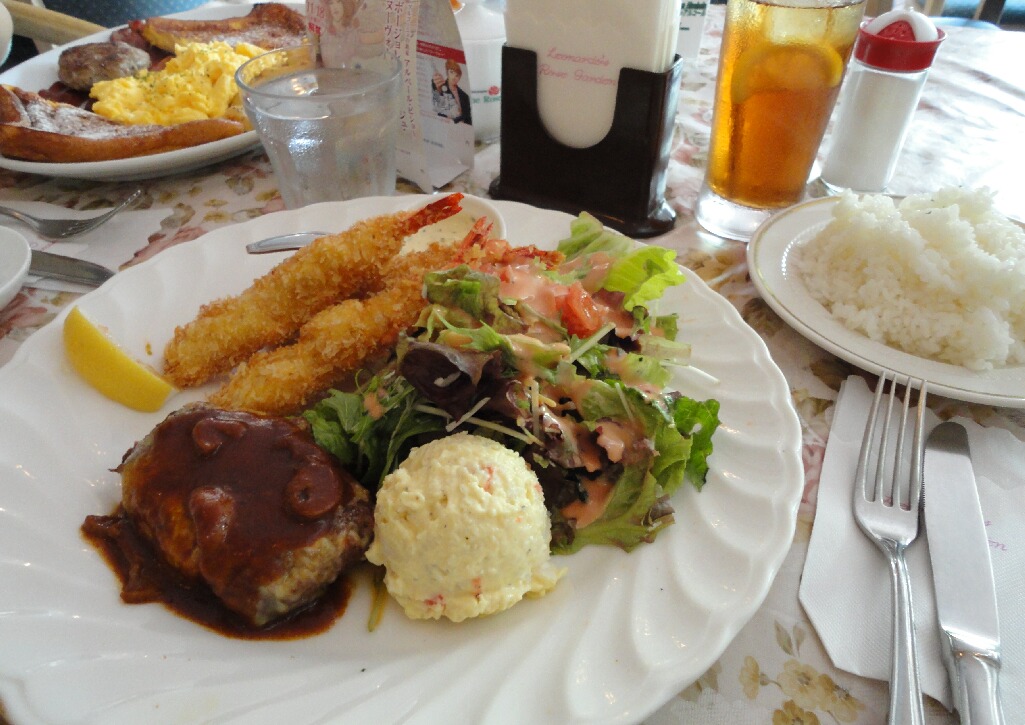 ようやく飛んできた相棒と早速ローズガーデン様へGO。相変わらず米軍さんでいっぱい、相変わらず皿もでっかい素敵なお店です。そして相変わらず美味い最高のお店です(ちょっと言いすぎ)。これ、チーズハンバーグとエビフライのランチ。味付けがどれもど真ん中でなんてこったい(意味不明)この店家の近くに欲しいなぁ~。他にも魅力的過ぎるメニューがわんさかあって、ほんと、沖縄行く時は毎回お世話になりたいお店です。ってか、沖縄でそういう飲食店と出会えたことがすごい(笑)