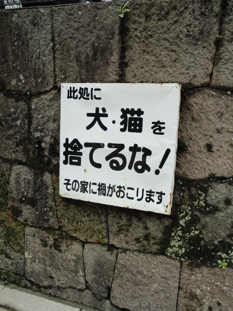 散策途中に道路わきに張ってあった看板。「捨てるな!」のつづきの文言が怖すぎる(笑)そんなにここ捨て犬・猫が多かったんだろうか・・・・。