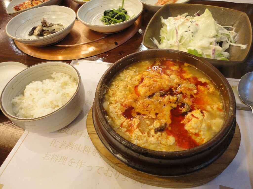 こちらはシメに食べたスンドゥプチゲ。これね、すごい辛かったの・・・・(号涙)混ぜたら下から真っ赤な汁が溢れてくるわ特大青唐辛子のブツ切り入ってるわ・・・。あまりの辛さに慄きながら前屈みで食べてたら内臓を痛めましたズコー(死)でも辛さの奥に深みのある出汁の味があって美味しかった。辛ウマ。もう2段階ほど辛さを抑えてもらえたら間違いなく旨いと思う。なんか色んな液体目とか鼻とかから流して食べてたら、店のお姉さんが無言でスイカ持ってきてくれた(笑)