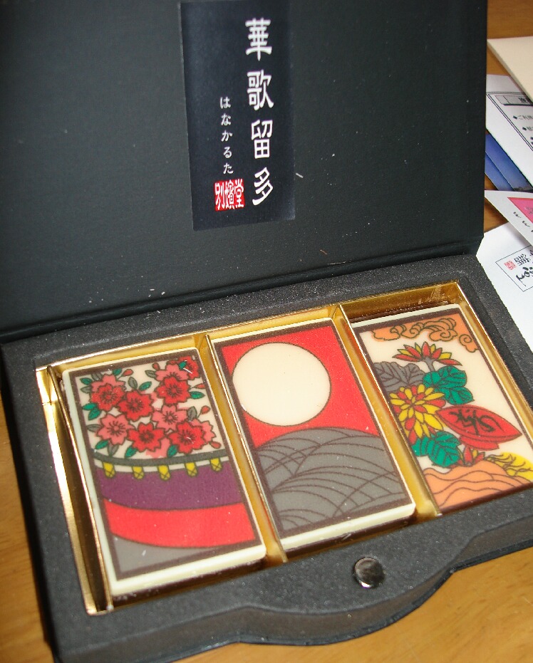 この花札チョコ、神戸のお菓子屋さんのチョコで、一目見てこれは私が買わんといかん!と思った代物です。花札大好き。確かものごころついた時には
