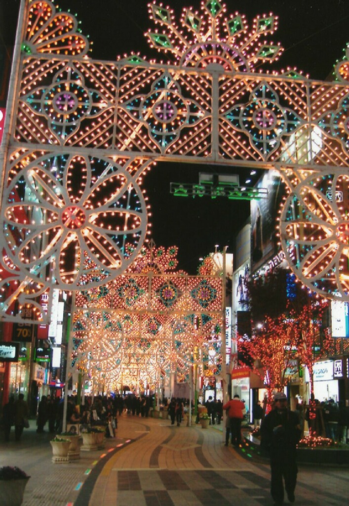 右画像は南浦洞のメインストリートの光復路のイルミネーション。この時は旧正月前だったからイルミネーション点いてたみたい。クリスマスから旧正月にかけてずっと点いてるのかもしれないけど。